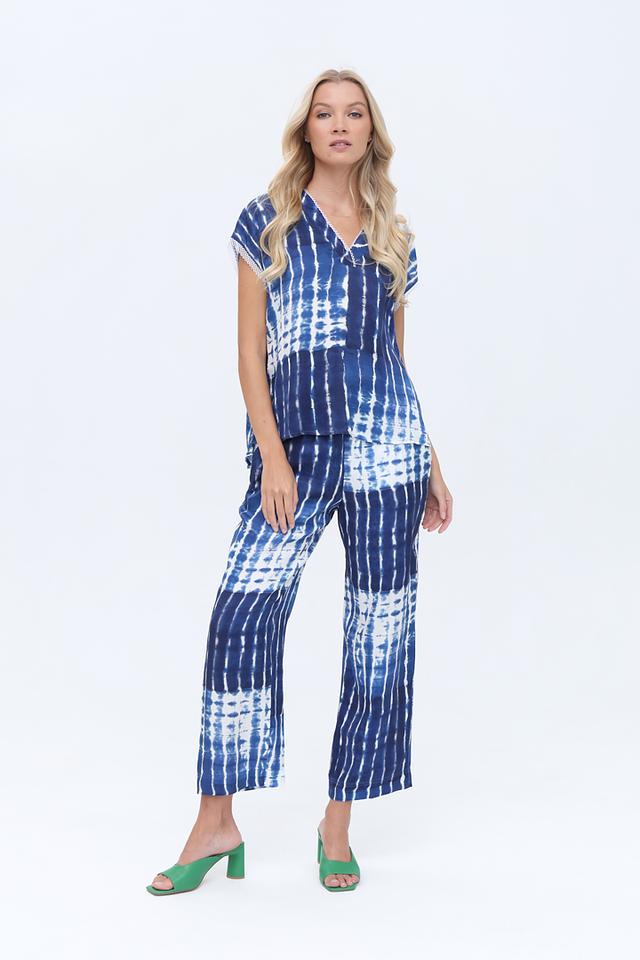 Блуза выполнена в технике tie-dye, с уникальным узором, сочетающим различные оттенки синего и белого. V-образный вырез и короткие рукава придают модели лёгкость и непринуждённость. Рукава декорированы изящным кружевом, добавляющим женственности.