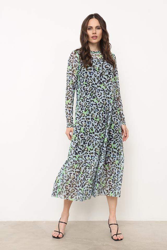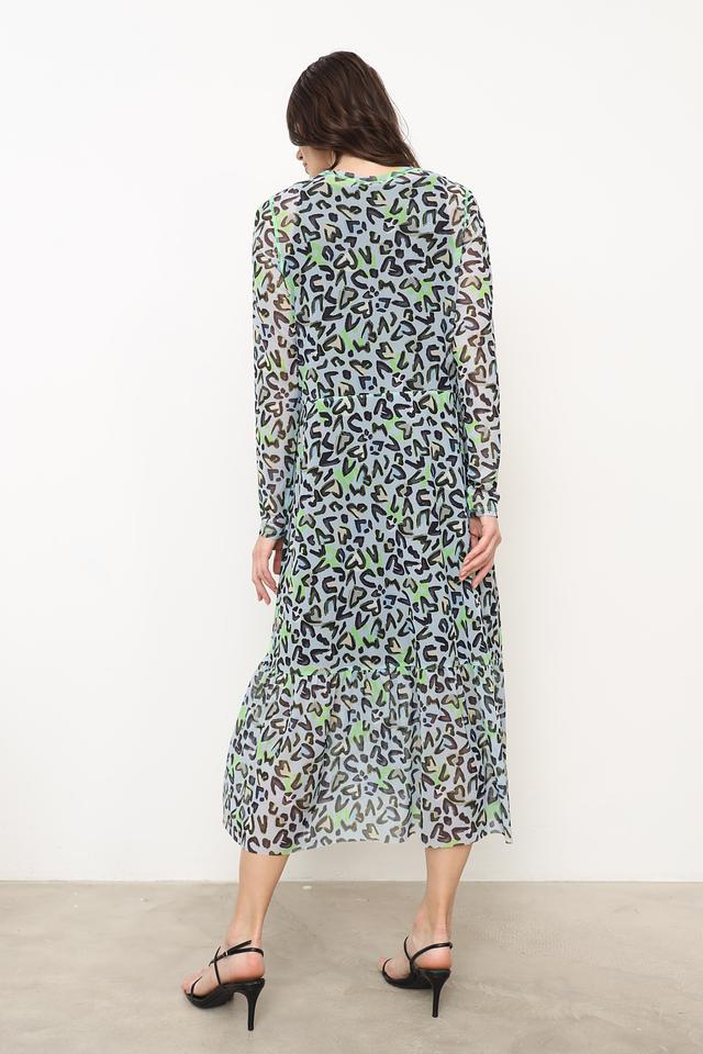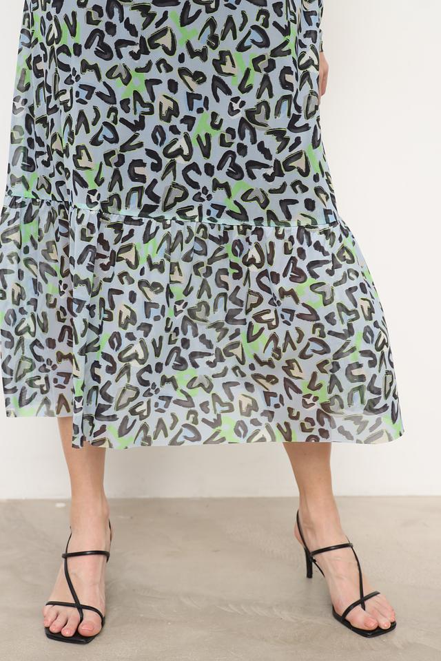 Это элегантное платье от Marc Cain выполнено из легкой и воздушной ткани, состоящей из 90% полиэстера и 10% эластана. Преобладающий цвет платья – голубой, украшенный ярким леопардовым принтом в оттенках зеленого и серого.