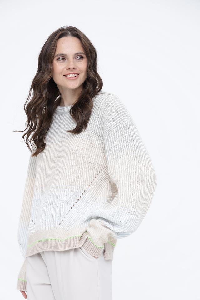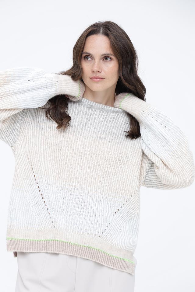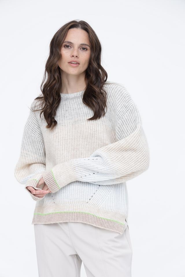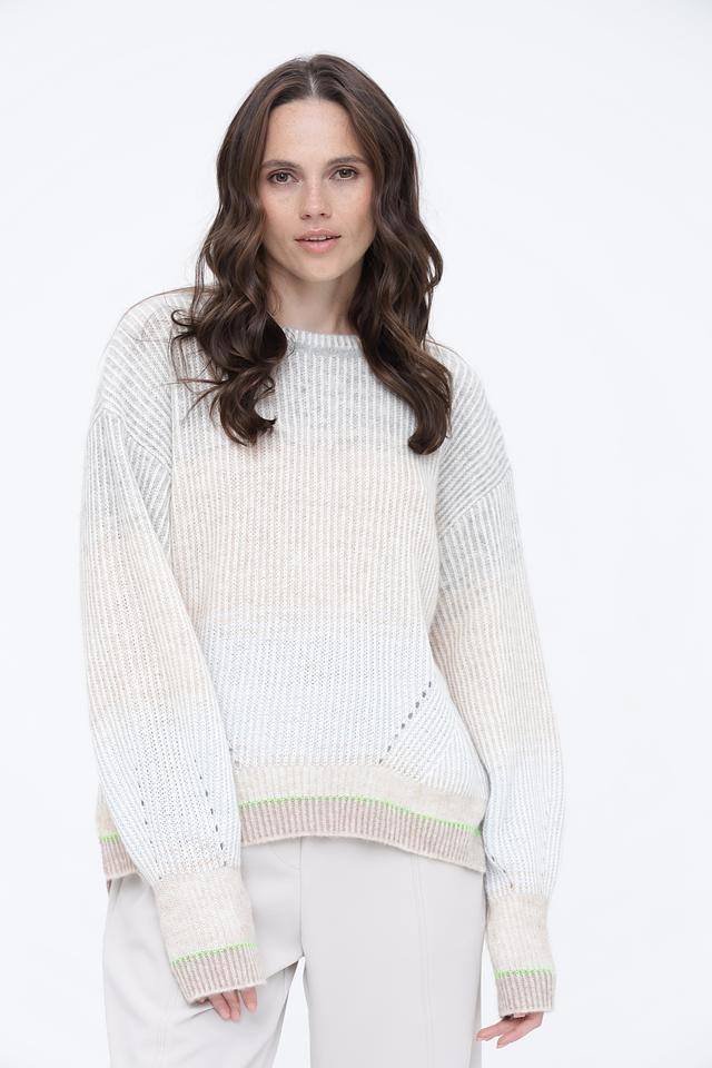 Светло-бежевый пуловер Marc Cain из смесовой шерсти с деликатной вязкой и зелёной отделкой на манжетах и подоле. Модель имеет свободный крой и круглый вырез горловины. Состав: шерсть 27%, полиамид 22%, альпака 20%, вискоза 18%, кашемир 13%