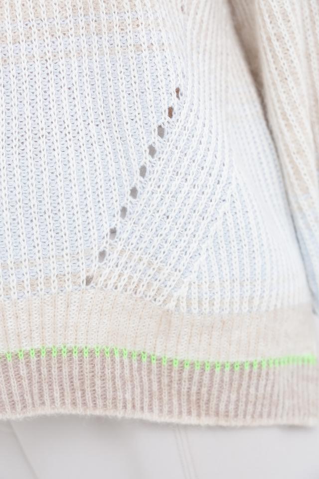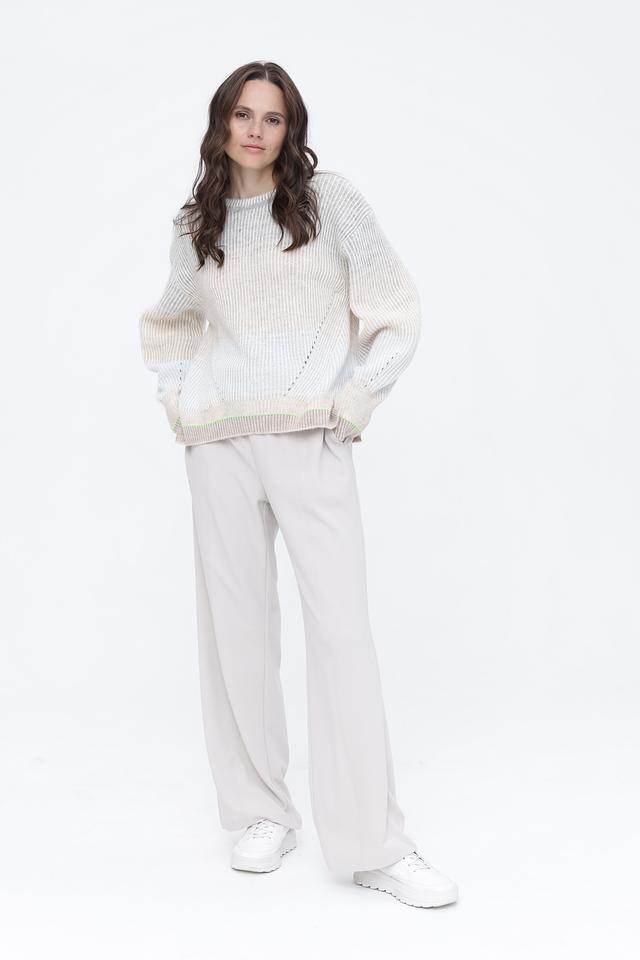 Модель имеет свободный, слегка оверсайз крой, который позволяет создать расслабленный и непринужденный образ. Пуловер выполнен в светло-бежевом цвете с деликатной вязкой, которая придает ему текстуру и объем.