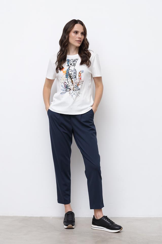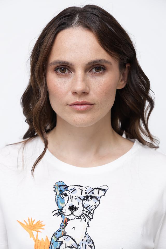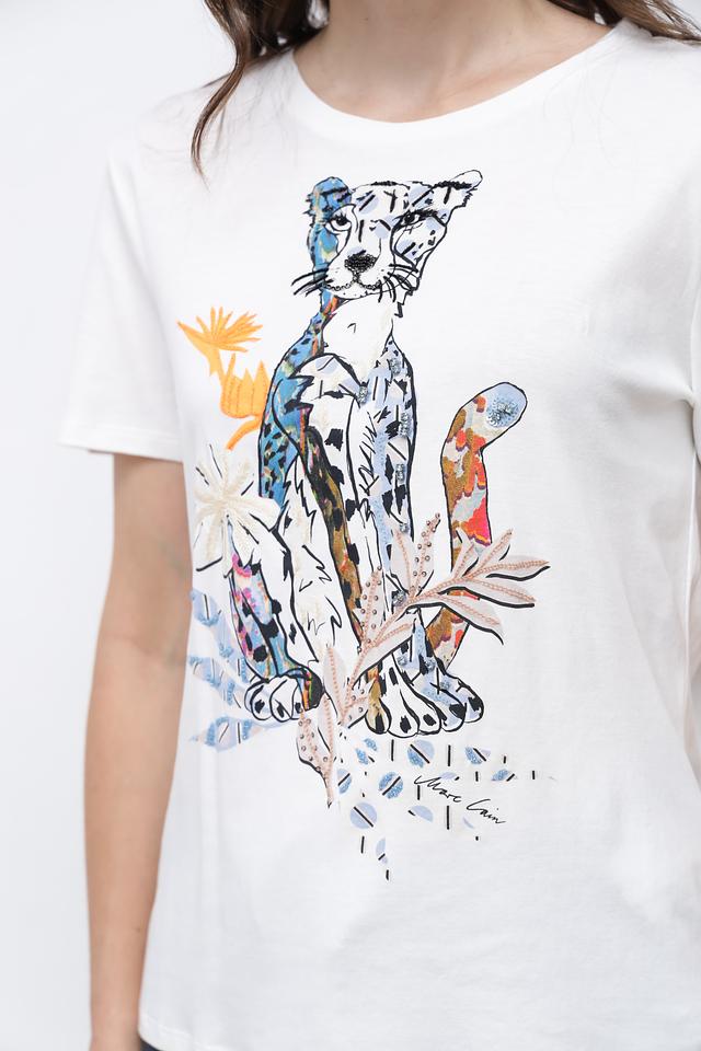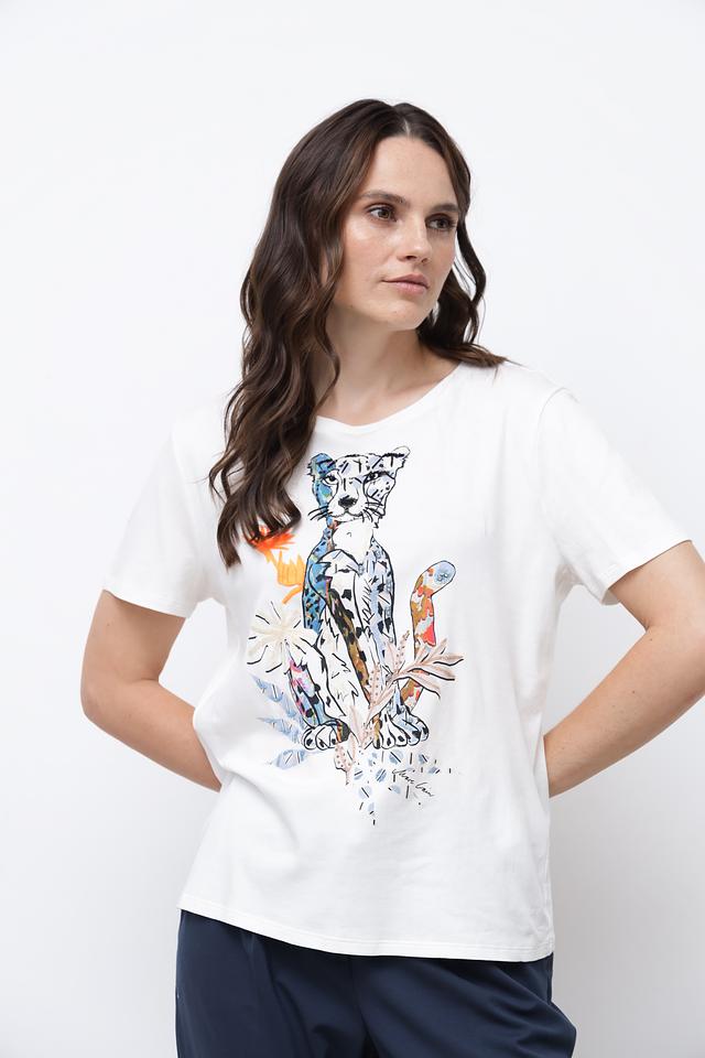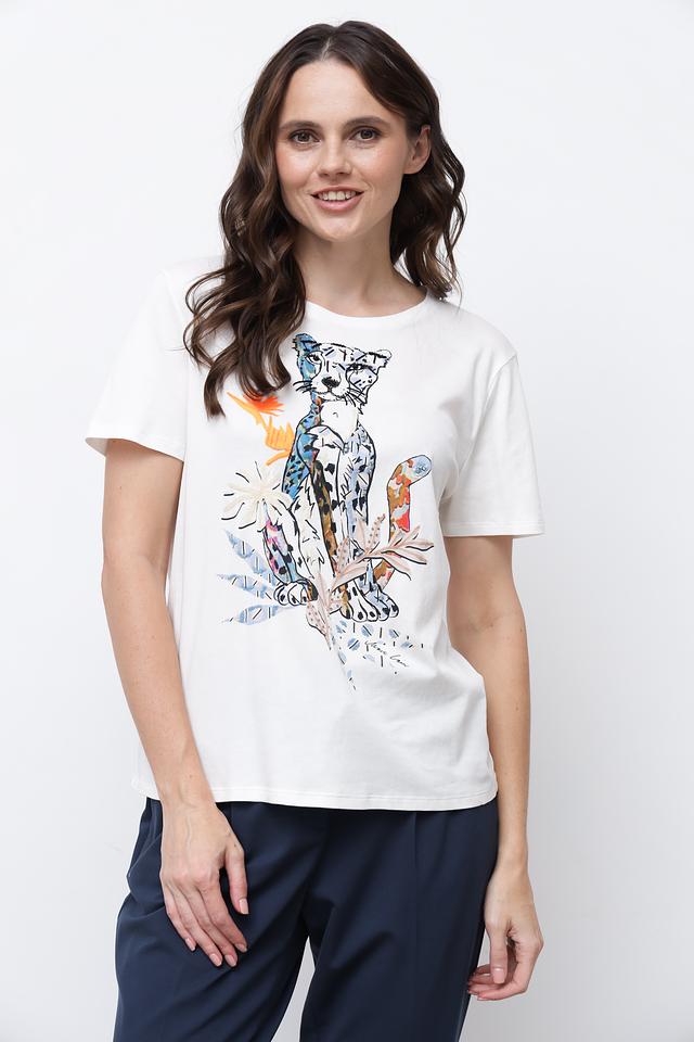Основным акцентом модели является яркий и детализированный принт леопарда, выполненный в насыщенных цветах. Принт добавляет образу оригинальности и индивидуальности. Крой футболки – свободный, прямой, что обеспечивает свободу движений и позволяет сочетать ее с различными элементами гардероба.