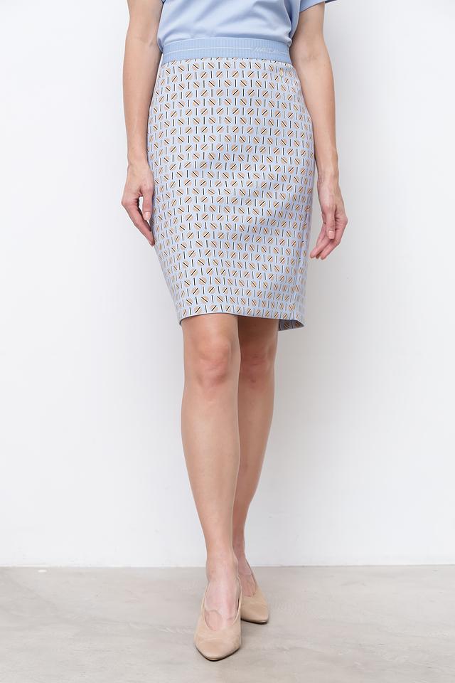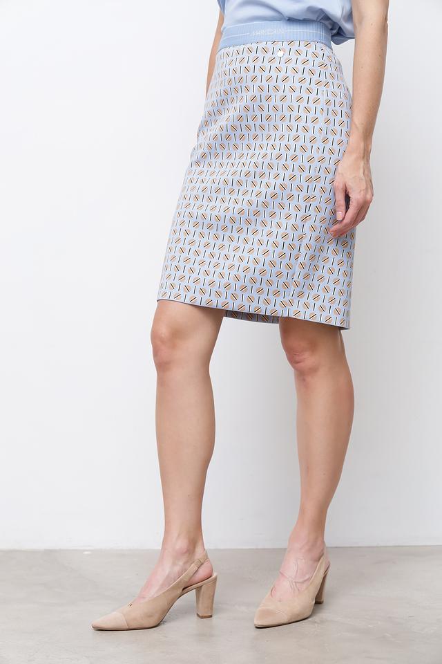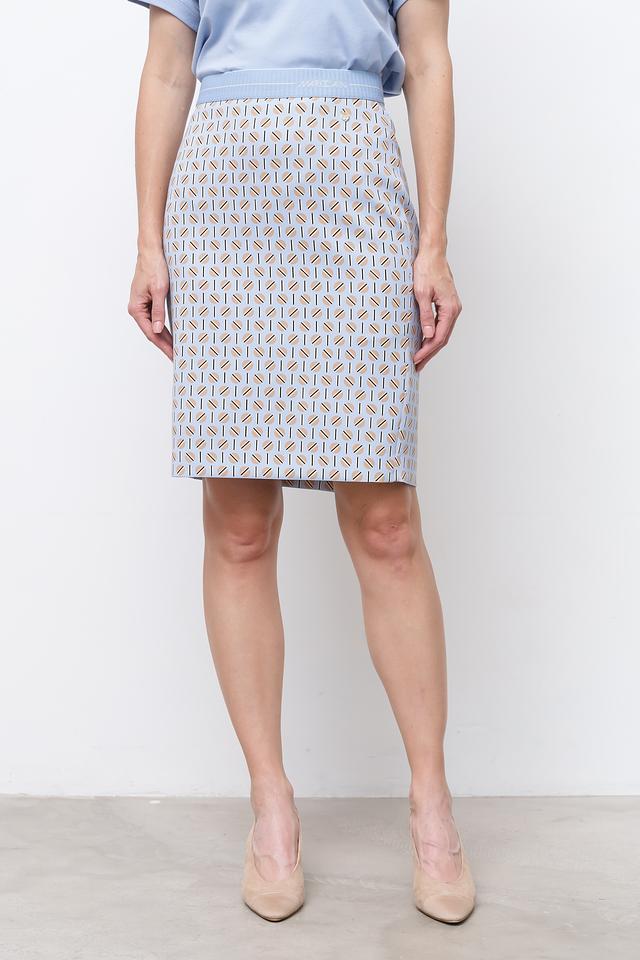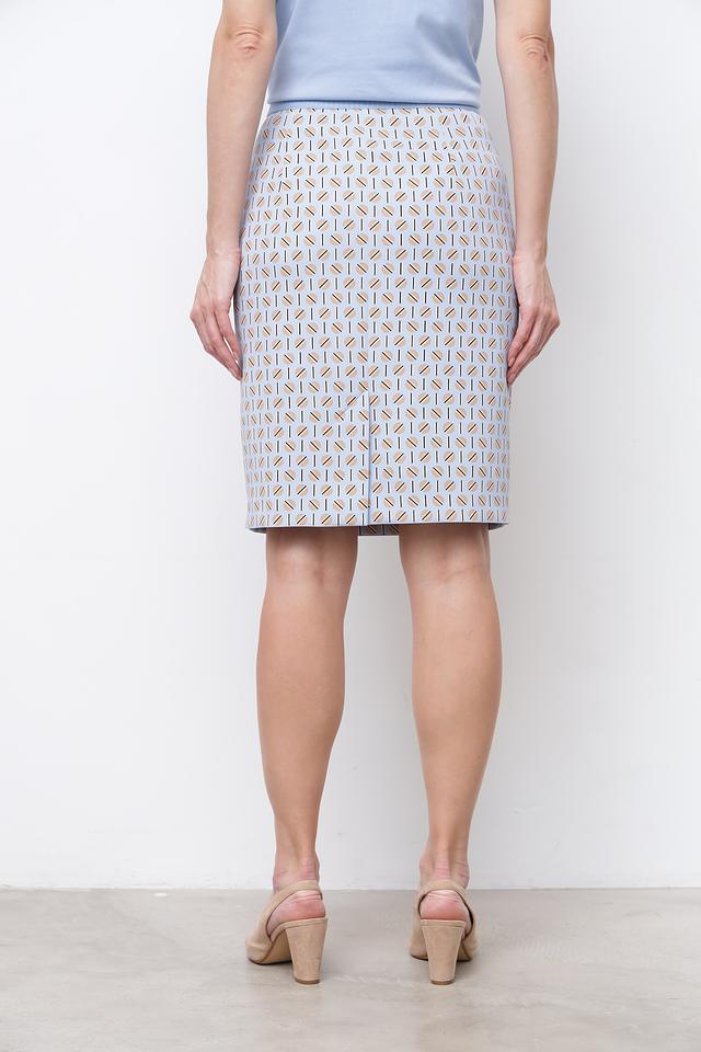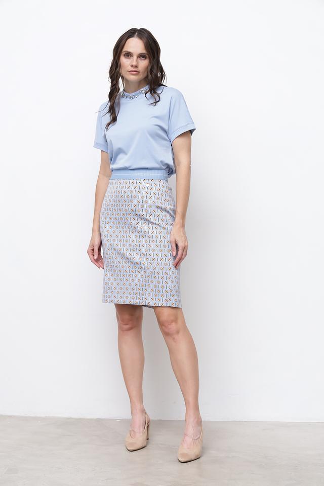 Юбка имеет классический крой и длину до колена, что делает ее универсальной для различных случаев. Особенностью модели является стильный геометрический принт, выполненный в сочетании светло-серых, бежевых и коричневых оттенков. Принт придает юбке изысканность и оригинальность.