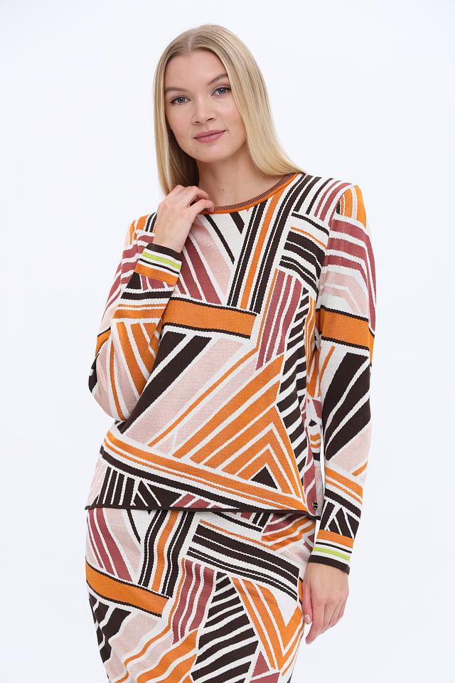 Женский пуловер Marc Cain оранжево-коричневого цвета с ярким геометрическим принтом. Модель выполнена из мягкой вискозы с добавлением хлопка и полиэстера, обеспечивающих комфорт и износостойкость. Состав: вискоза 59%, хлопок 39%, полиэстер 2%