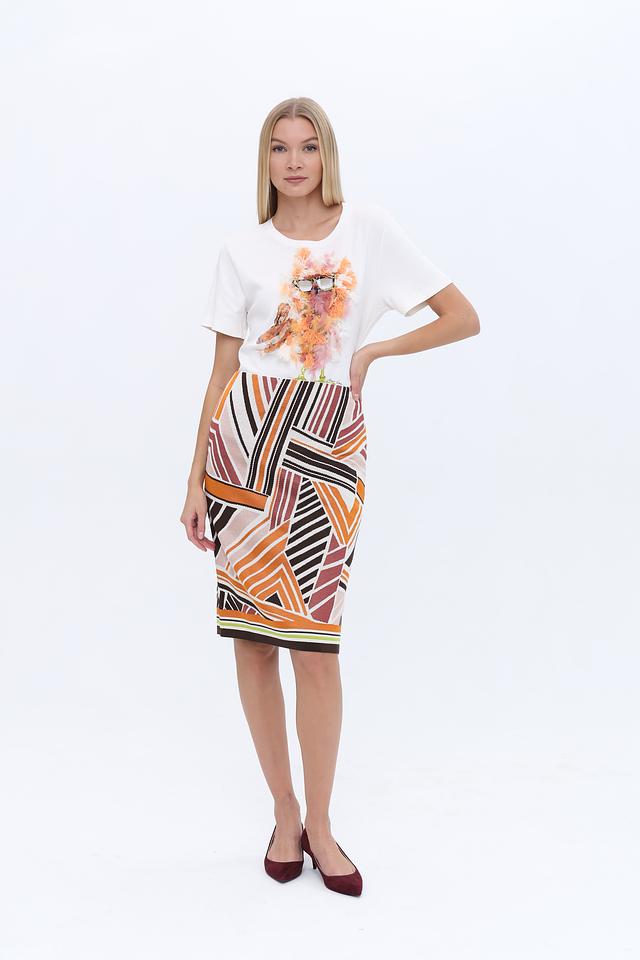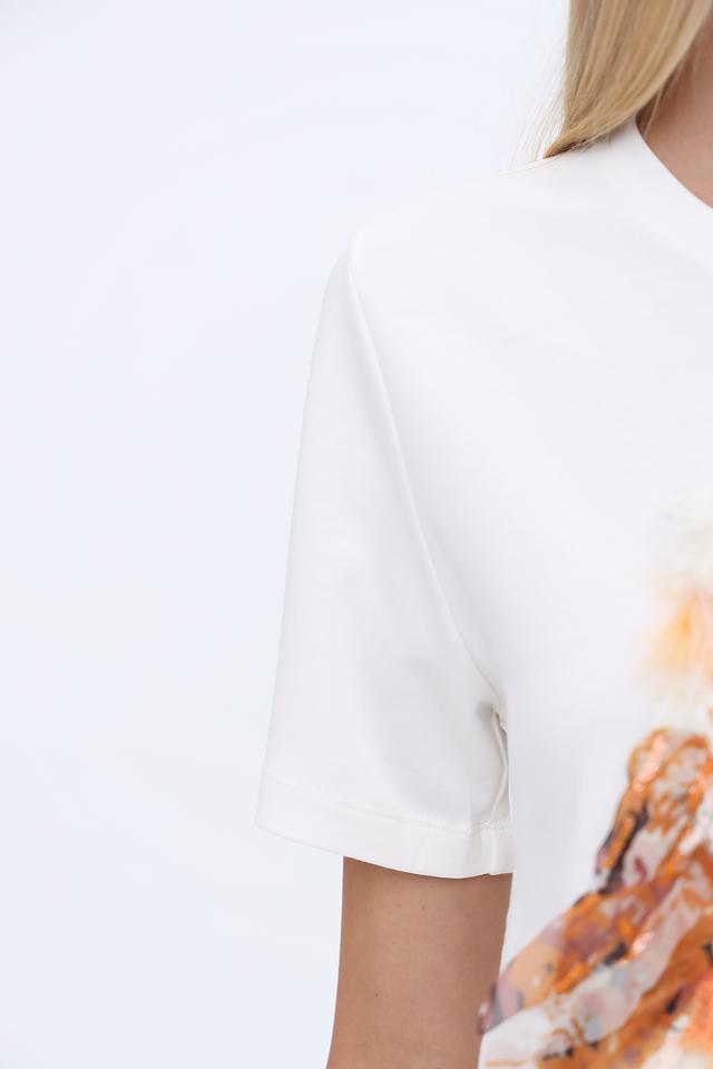 Основным элементом декора является яркий принт совы, выполненный в акварельной технике с использованием оранжевых, розовых и коричневых оттенков. Принт придает футболке неповторимый и запоминающийся вид.