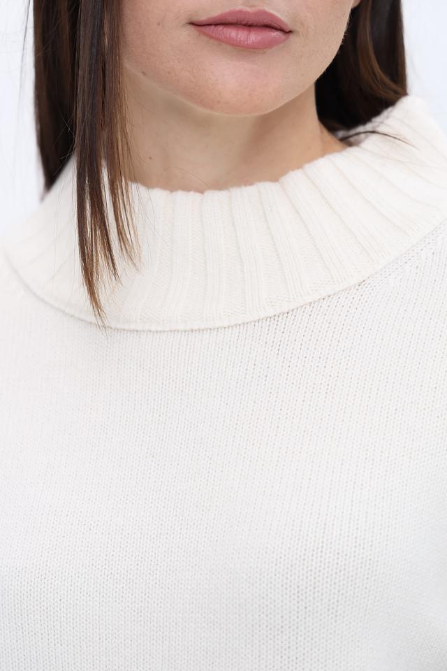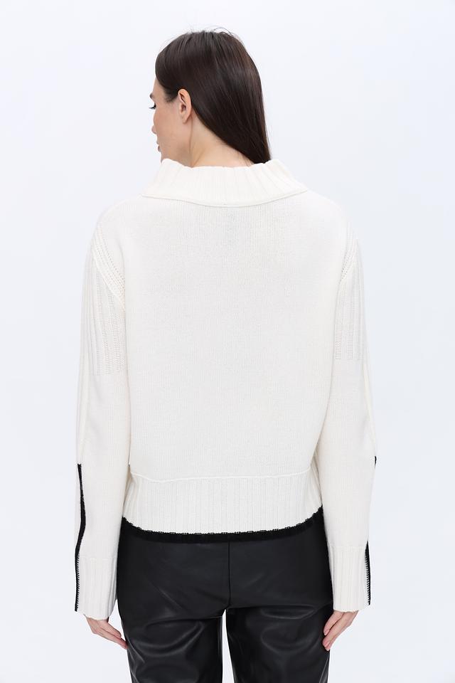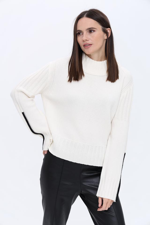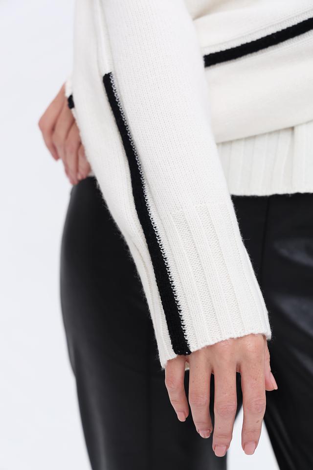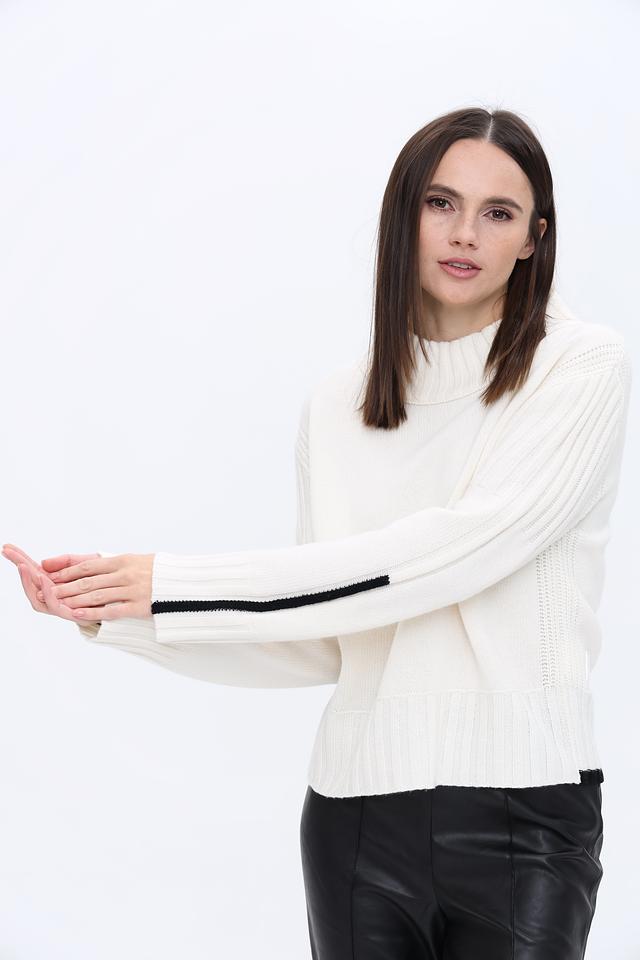 Белый пуловер Marc Cain из шерсти и кашемира с чёрными полосками на рукавах. Модель с высоким воротом и слегка спущенной линией плеч станет отличным дополнением к вашему гардеробу. Состав: шерсть 90%, кашемир 10%