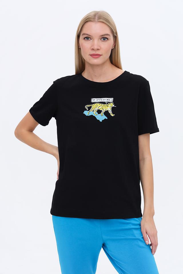 Главная особенность этой модели – яркий и оригинальный принт гепарда с забавной надписью. Этот принт добавляет футболке индивидуальности и делает ее отличным акцентом в вашем гардеробе. Футболка идеально сочетается с джинсами, шортами или юбками.