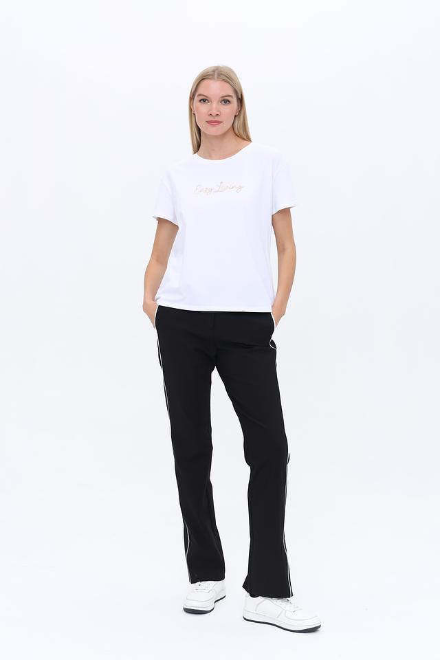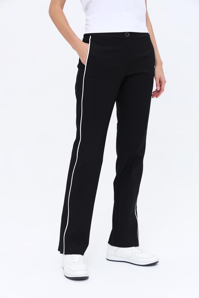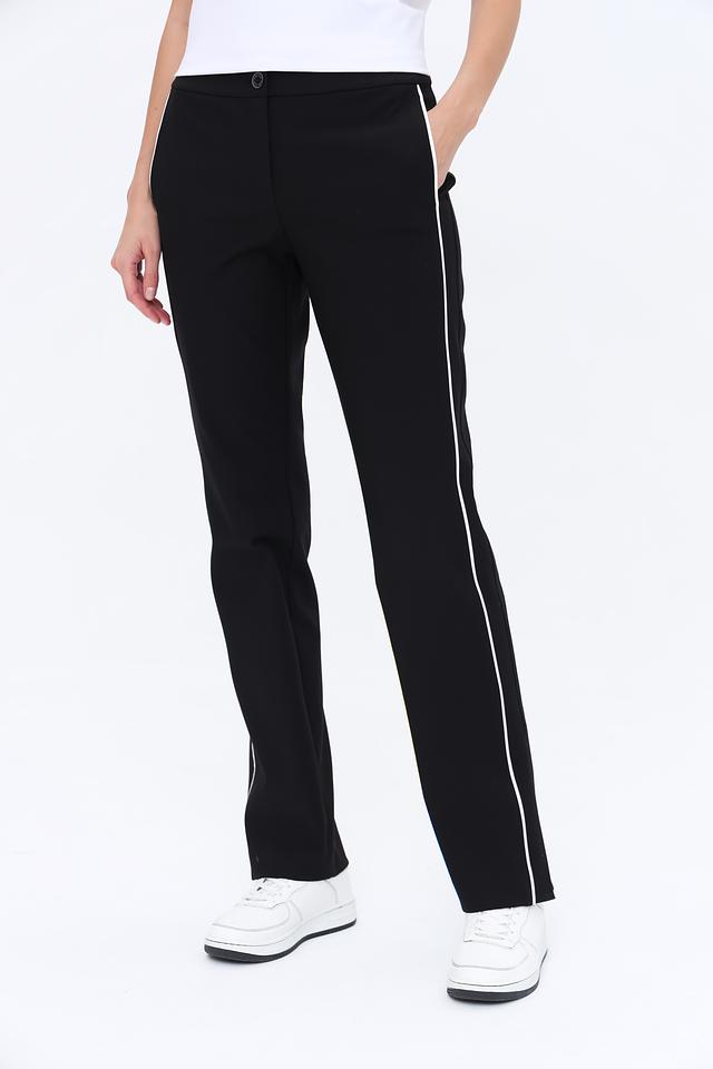 Женские брюки Marc Cain чёрного цвета с контрастной белой полосой по бокам. Модель выполнена из смесовой ткани с добавлением эластана для комфортной посадки и свободы движений. Состав: хлопок 51%, полиэстер 36%, эластан 13%