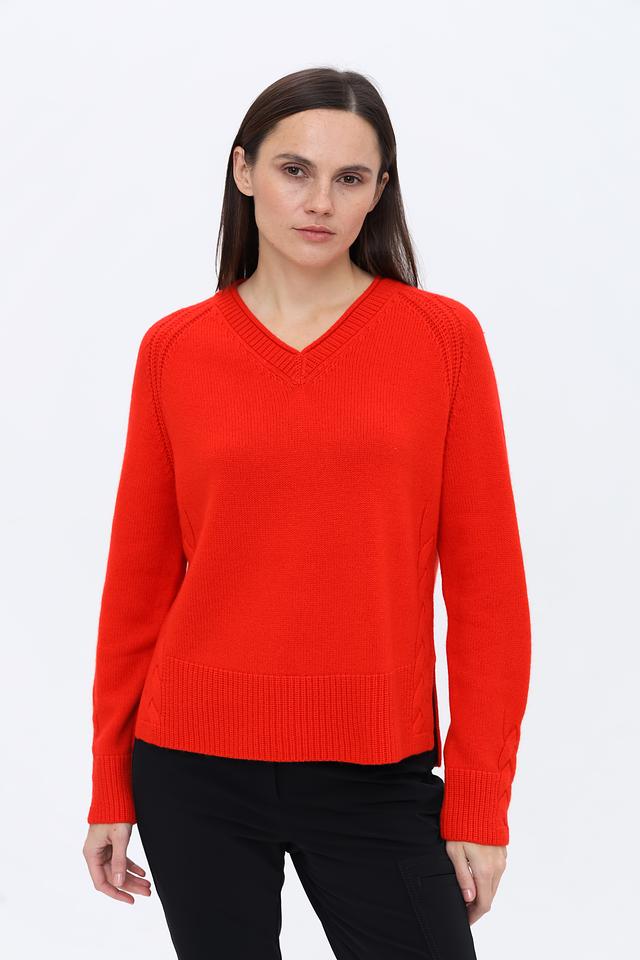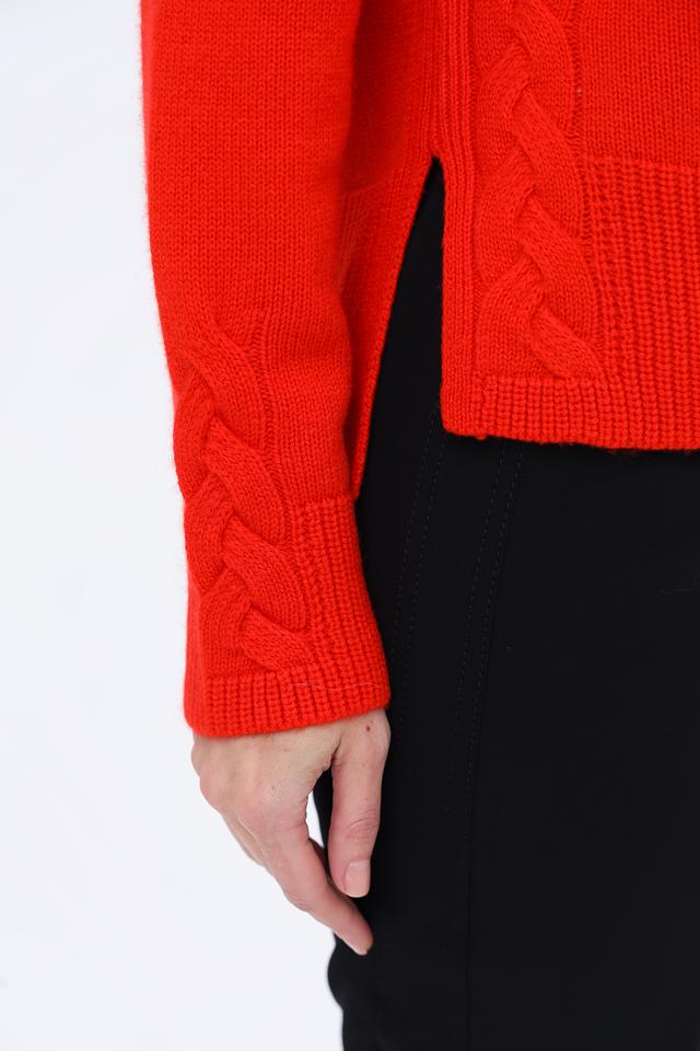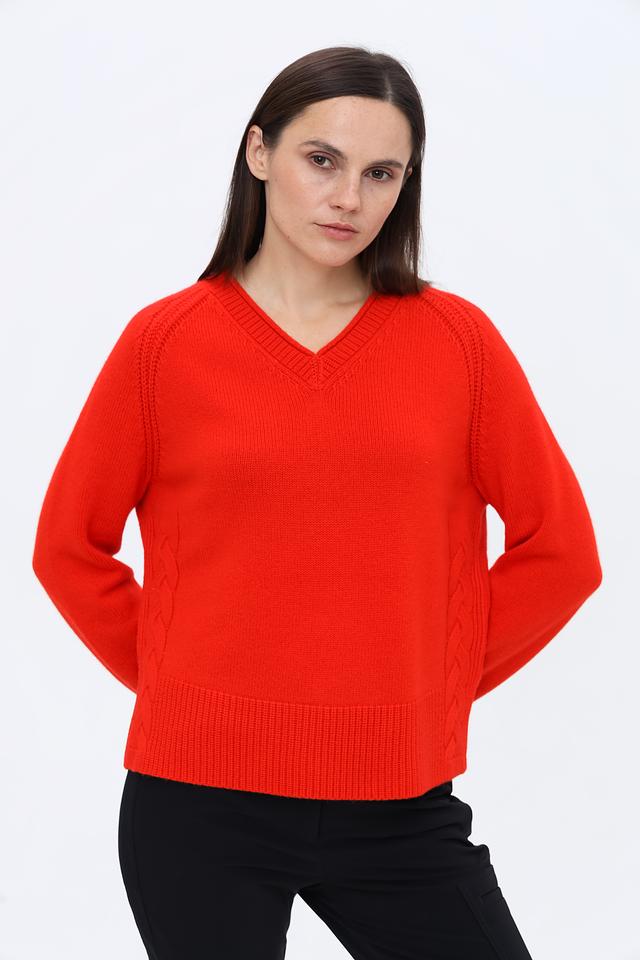 Особый акцент в дизайне пуловера – узор в виде кос, который украшает плечи и манжеты. Этот декоративный элемент придает изделию изысканность и оригинальность. Яркий красный цвет добавит вашему образу энергии и позитива.