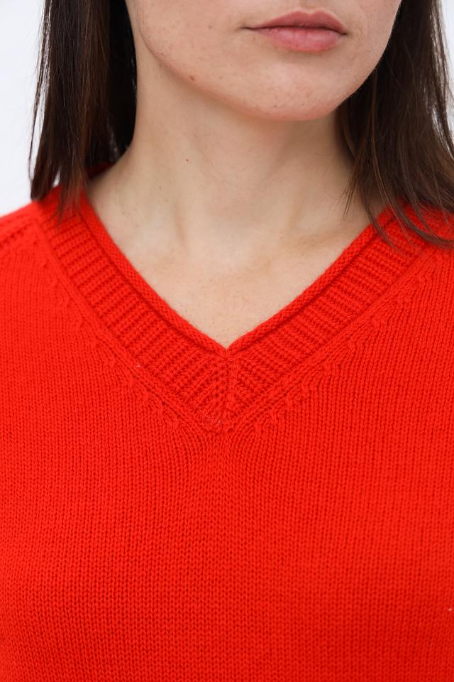 Красный пуловер Marc Cain из шерсти и кашемира с V-образным вырезом. Модель выполнена с узором в виде кос на плечах и манжетах, что придает ей особый шарм и элегантность. Сочетает в себе комфорт и стиль. Состав: шерсть 90%, кашемир 10%