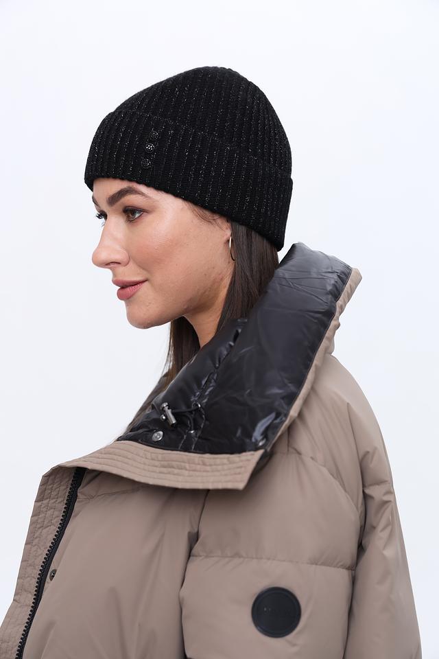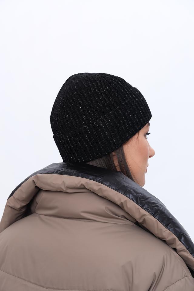 Шапка имеет классическую форму и плотно прилегает к голове, обеспечивая надежную защиту от холода. Декорирована мелкими пайетками, которые придают изделию элегантный и праздничный вид. Чёрный цвет делает шапку универсальной и легко сочетаемой с любой верхней одеждой.
