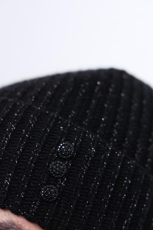 Чёрная шапка от Marc Cain, выполненная из премиального трикотажа с добавлением кашемира и декорированная пайетками. Аксессуар согреет в холодную погоду и добавит изысканности вашему образу. Состав: полиамид 36%, вискоза 28%, шерсть 28%, кашемир 5%, метализ.полиэстер 3%