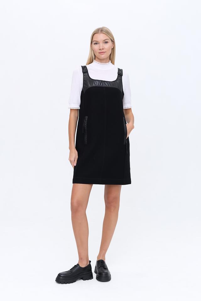 Особенностью модели являются вставки из чёрной кожи на лифе и по бокам, которые придают платью современный и стильный вид. Прямой крой и длина мини делают его подходящим для различных случаев – от повседневной носки до особых мероприятий.
