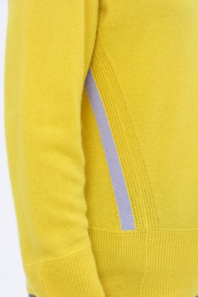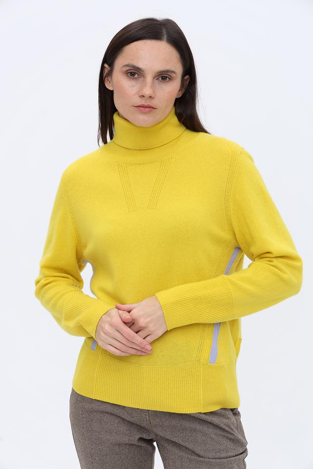 Пуловер имеет классический крой с высоким горлом, который подчеркивает элегантность силуэта. Яркий жёлтый цвет добавит свежести и позитива в ваш гардероб. Декоративные серые полоски на плечах и груди придают модели оригинальность и динамичный вид.