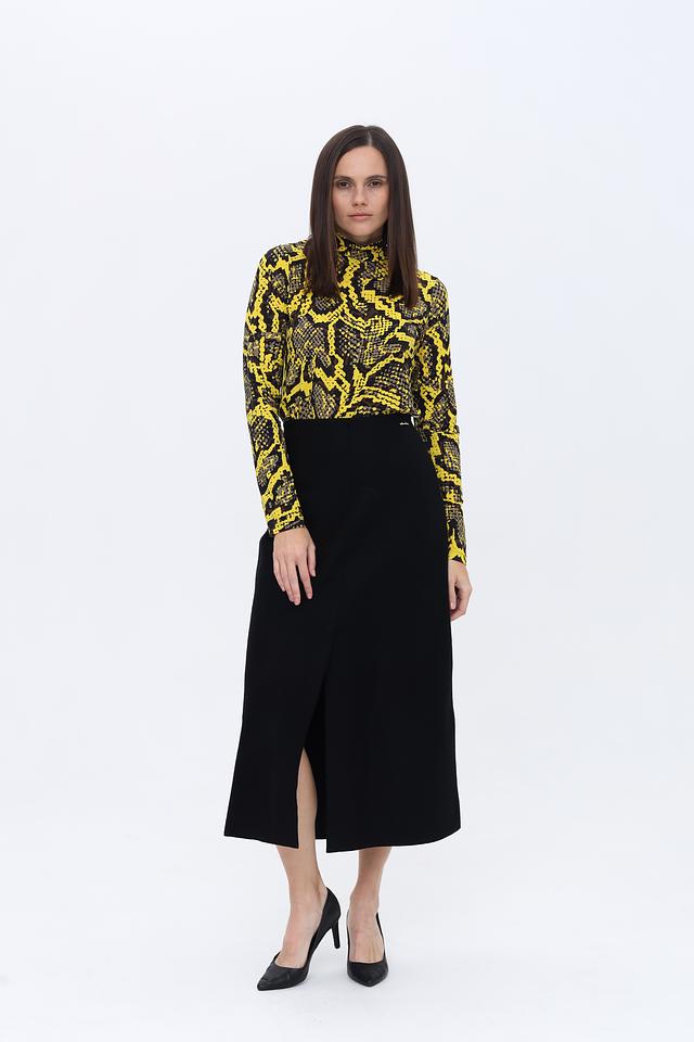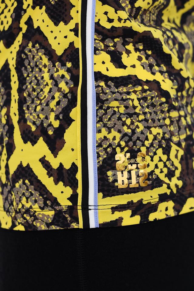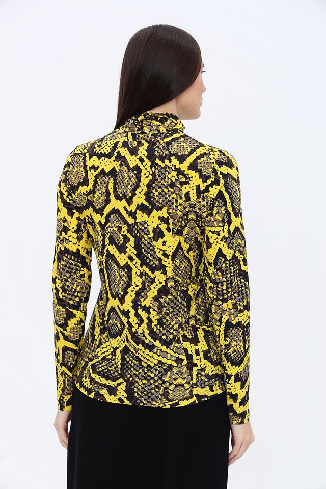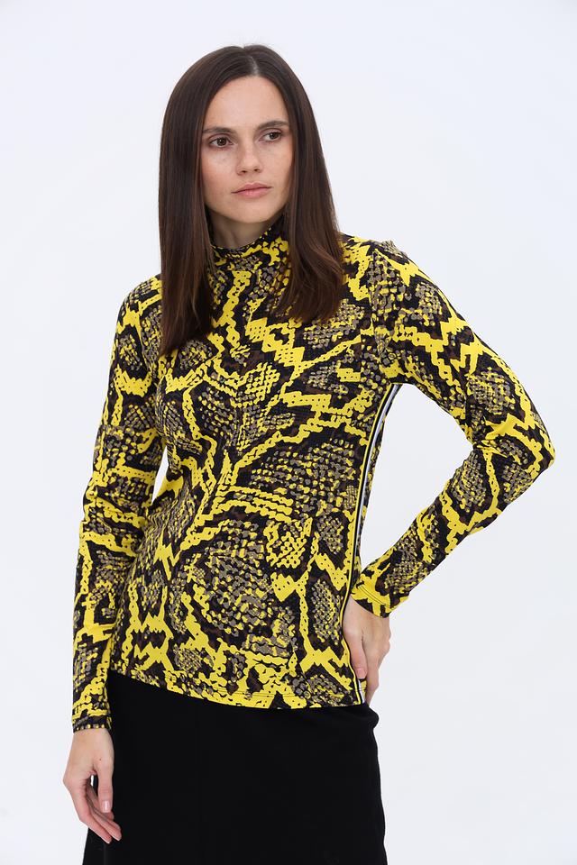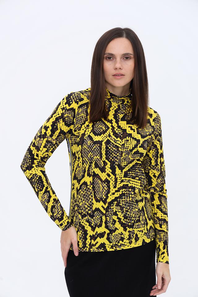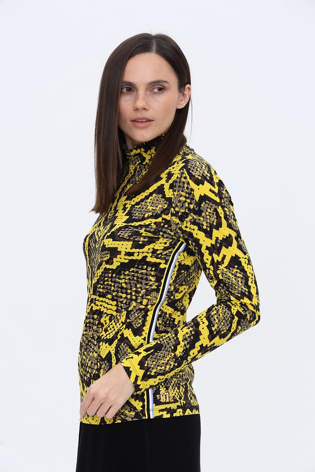 Эта стильная водолазка от Marc Cain выполнена в эффектном дизайне с принтом, имитирующим змеиную кожу. Основной цвет изделия – жёлтый, дополненный чёрными элементами рисунка.