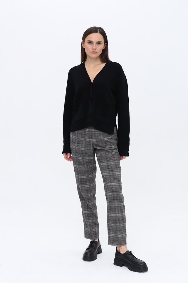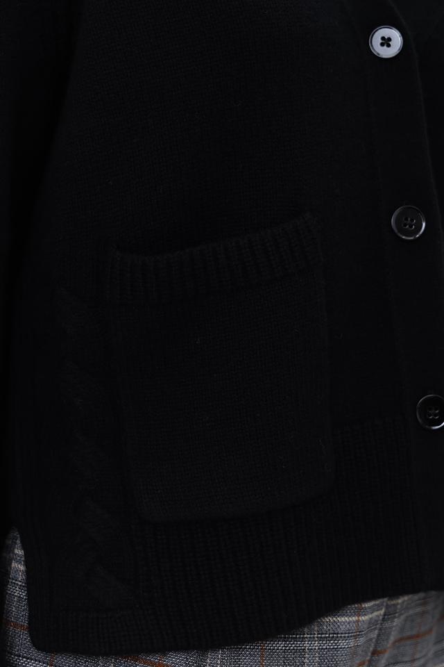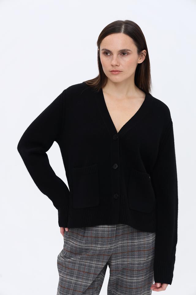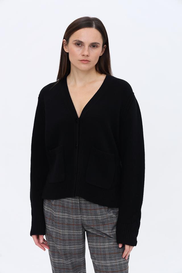 Чёрный кардиган Marc Cain из мягкой смеси шерсти и кашемира. Модель с V-образным вырезом и накладными карманами отличается комфортным кроем и лаконичным дизайном. Состав: шерсть 90%, кашемир 10%