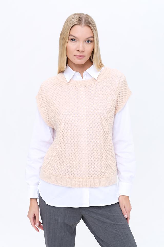 Персиковый вязаный жилет Marc Cain из тонкой пряжи с ажурным узором. Модель свободного кроя без рукавов станет стильным дополнением к вашему образу и подчеркнет индивидуальность. Состав: полиамид 75%, акрил 11%, альпака 9%, шерсть 5%