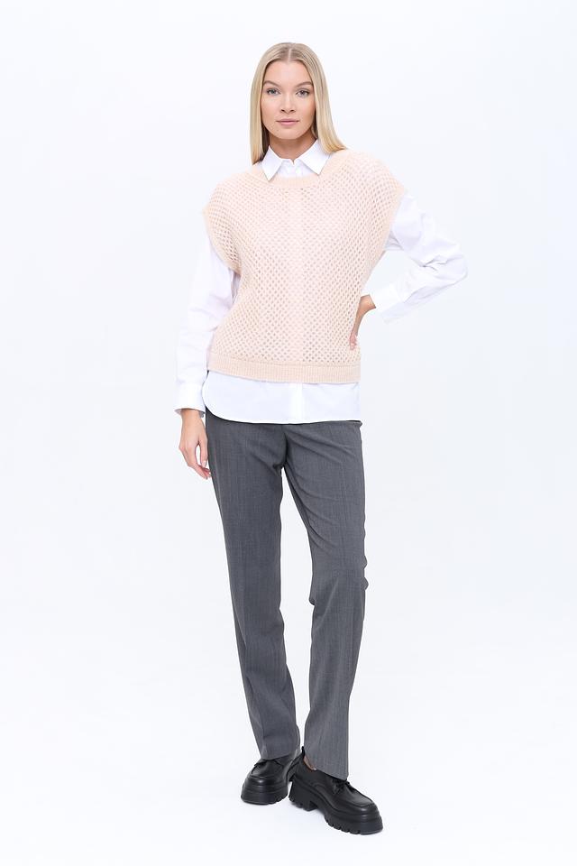 Жилет имеет свободный крой, который обеспечивает комфорт в носке и позволяет сочетать его с различными предметами одежды. Ажурный узор придает изделию воздушность и изысканность.