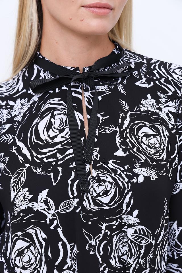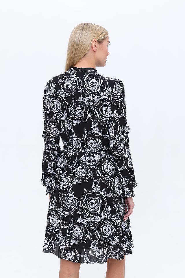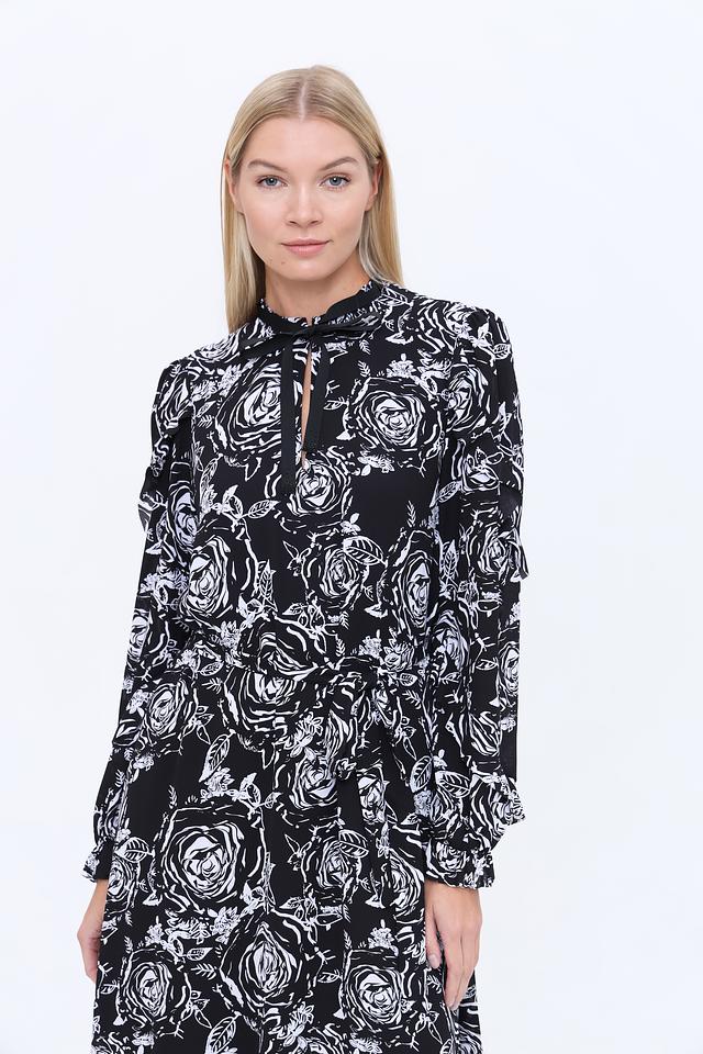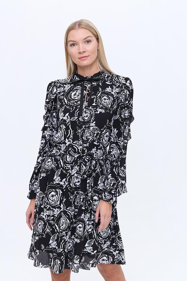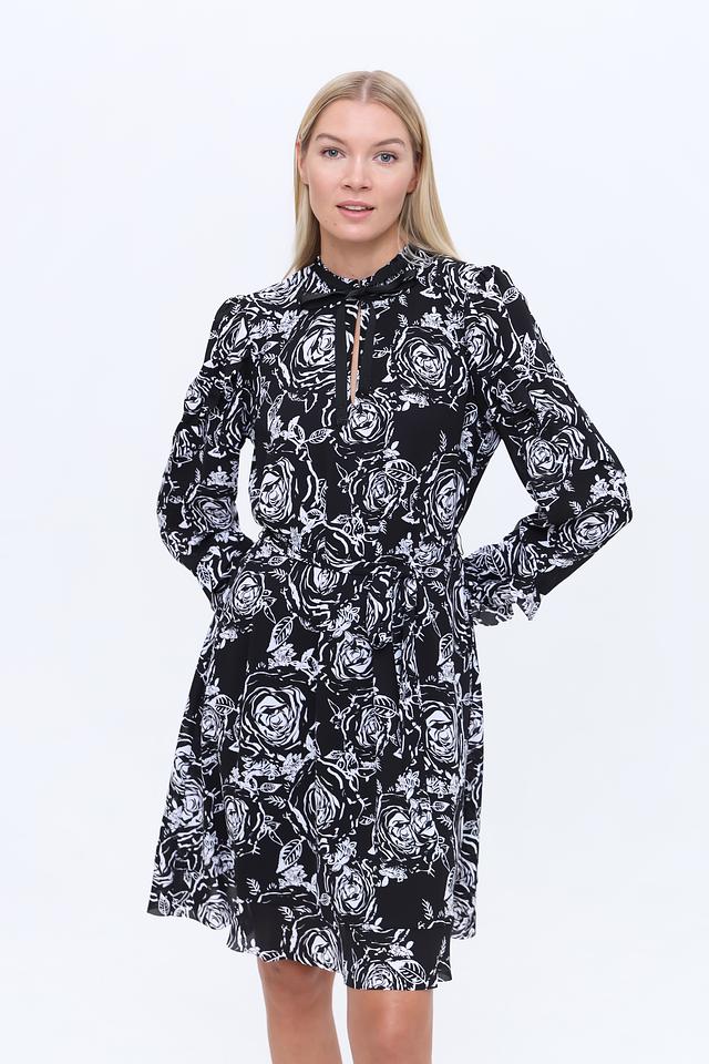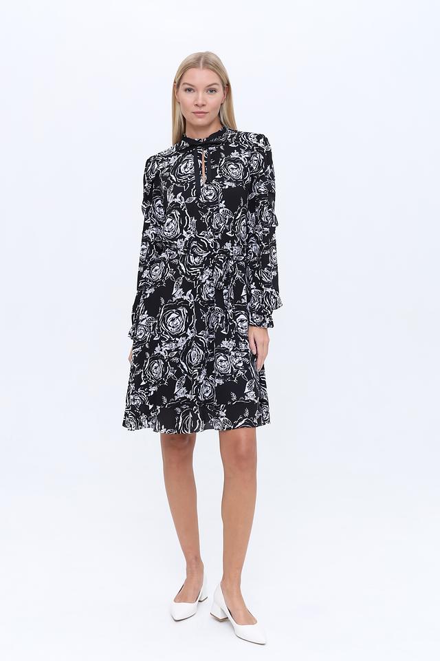 Платье имеет приталенный силуэт и длину до колена. Оно украшено ярким цветочным принтом в бело-чёрной гамме, который придает образу романтичность и свежесть.
