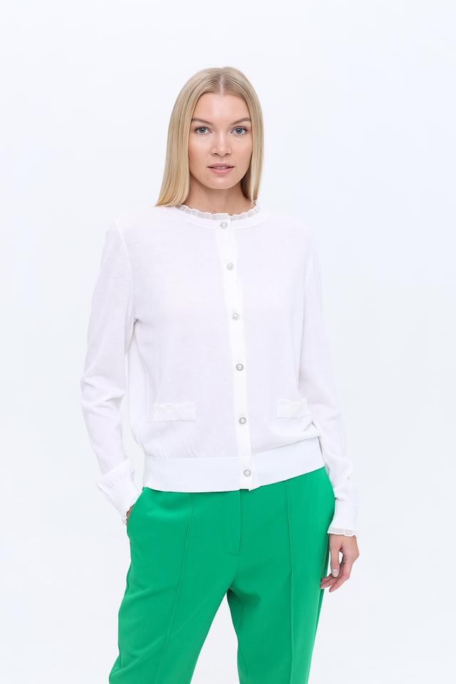 Особый шарм жакету придают декоративные рюши на горловине и манжетах рукавов. Это делает модель более женственной и изысканной. Жакет идеально сочетается с брюками, юбками и платьями, позволяя создавать разнообразные образы.