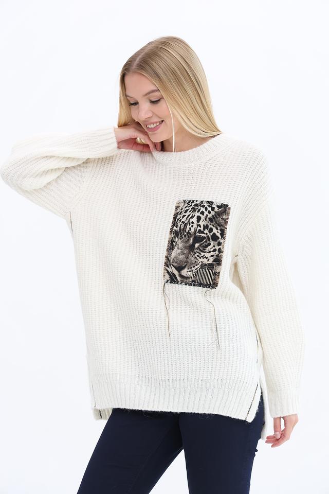 Пуловер имеет кремовый цвет и украшен эффектным принтом с изображением леопарда, который придает ему уникальный и запоминающийся вид. Свободный крой обеспечивает свободу движений, а округлый вырез горловины делает его универсальным для различных стилей.