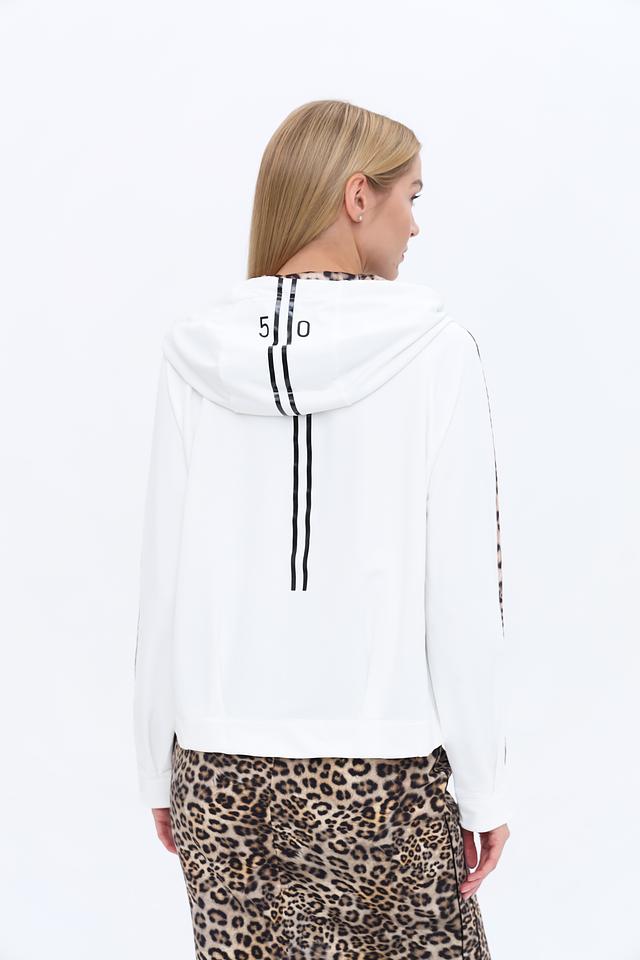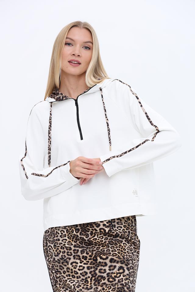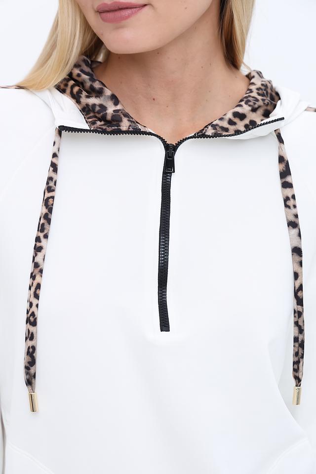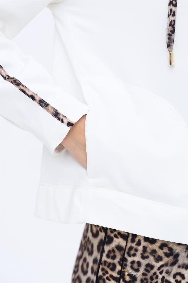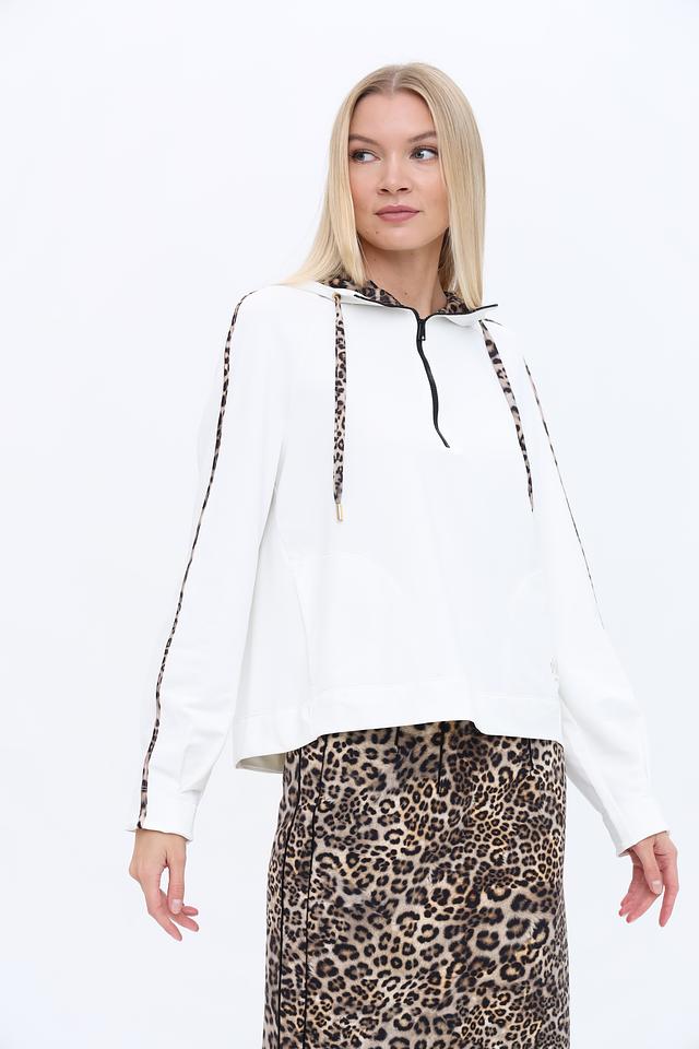 Белый пуловер Marc Cain с капюшоном и отделкой в леопардовый принт – стильное и комфортное решение для повседневного образа. Модель дополнена молнией на горловине и декоративными полосами по рукавам. Состав: полиамид 64%, хлопок 33%, эластан 3%