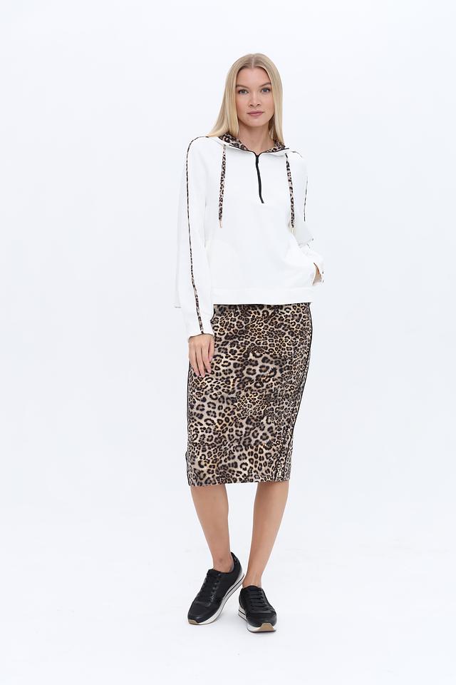 Особенностью данного пуловера является оригинальный декор в виде леопардового принта на капюшоне и по бокам изделия. Декоративные полосы добавляют динамики и подчеркивают современный стиль. Пуловер имеет свободный крой, обеспечивающий комфорт при носке.