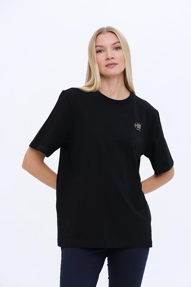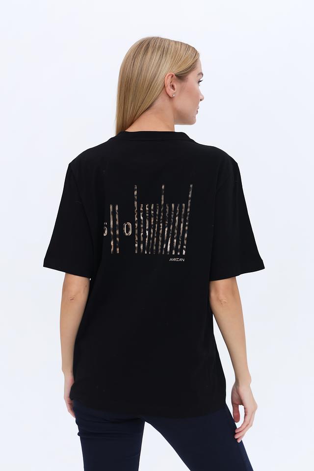 Чёрная футболка Marc Cain Collections из 100% хлопка с оригинальным графическим принтом. Модель свободного кроя с короткими рукавами станет отличным дополнением к вашему образу. Состав: хлопок 100%
