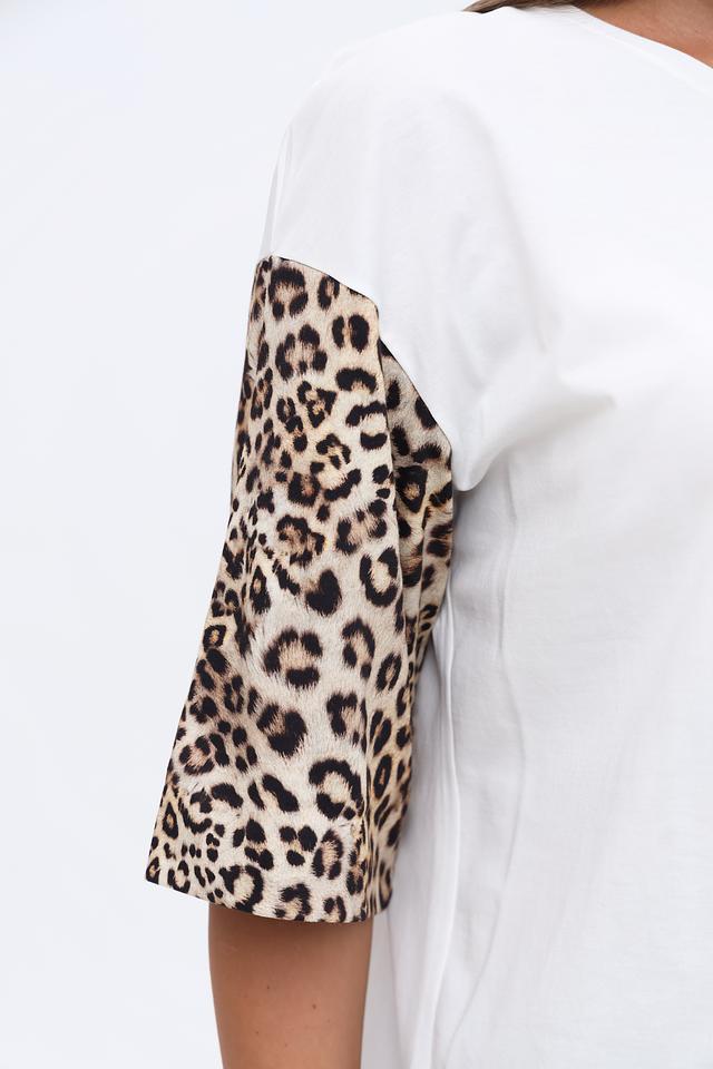 Особенностью модели являются короткие рукава с ярким леопардовым принтом, которые придают образу оригинальность и динамичность. На груди располагается небольшая золотистая надпись с логотипом бренда.