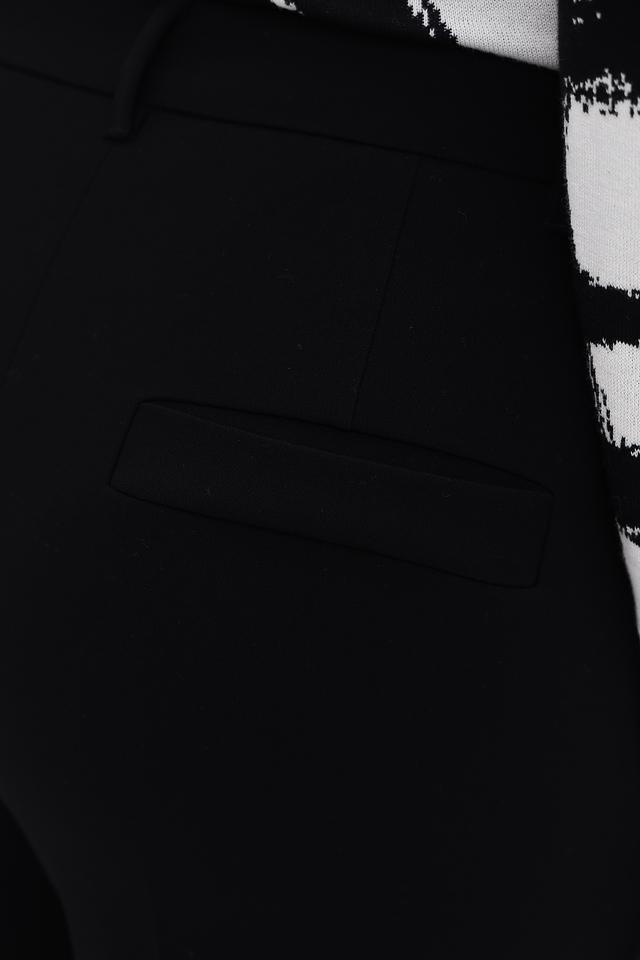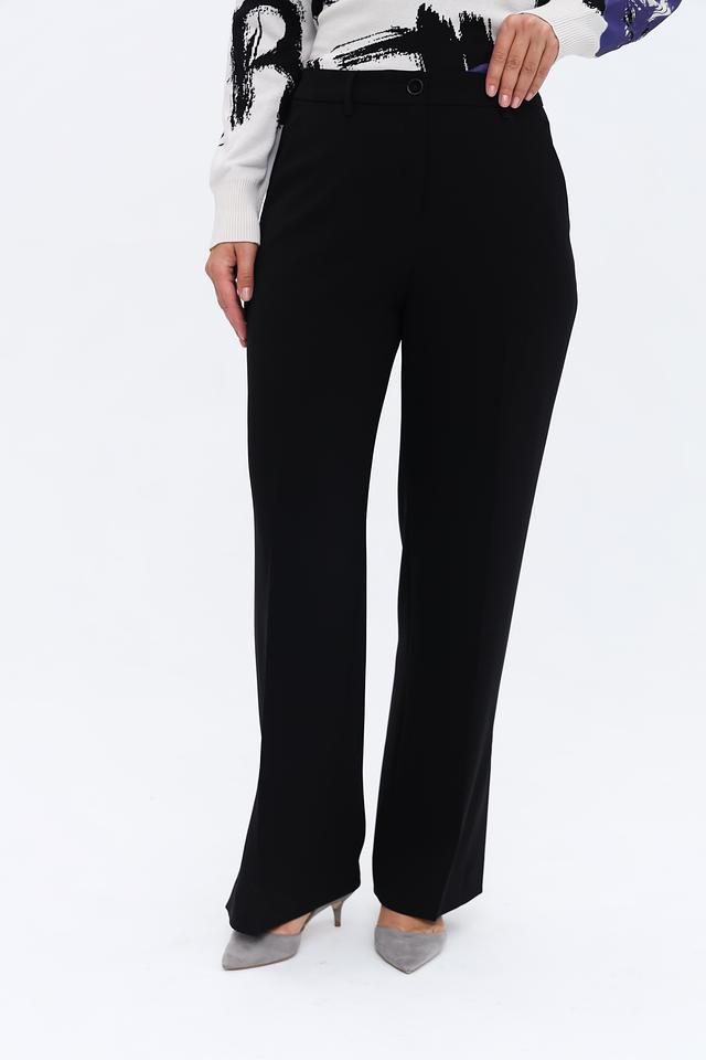 Брюки имеют прямую посадку, что обеспечивает комфорт в носке и подходит для различных типов фигуры. Высокая посадка визуально удлиняет ноги и подчеркивает талию. Застежка на пуговицу и молнию обеспечивает надежную фиксацию.