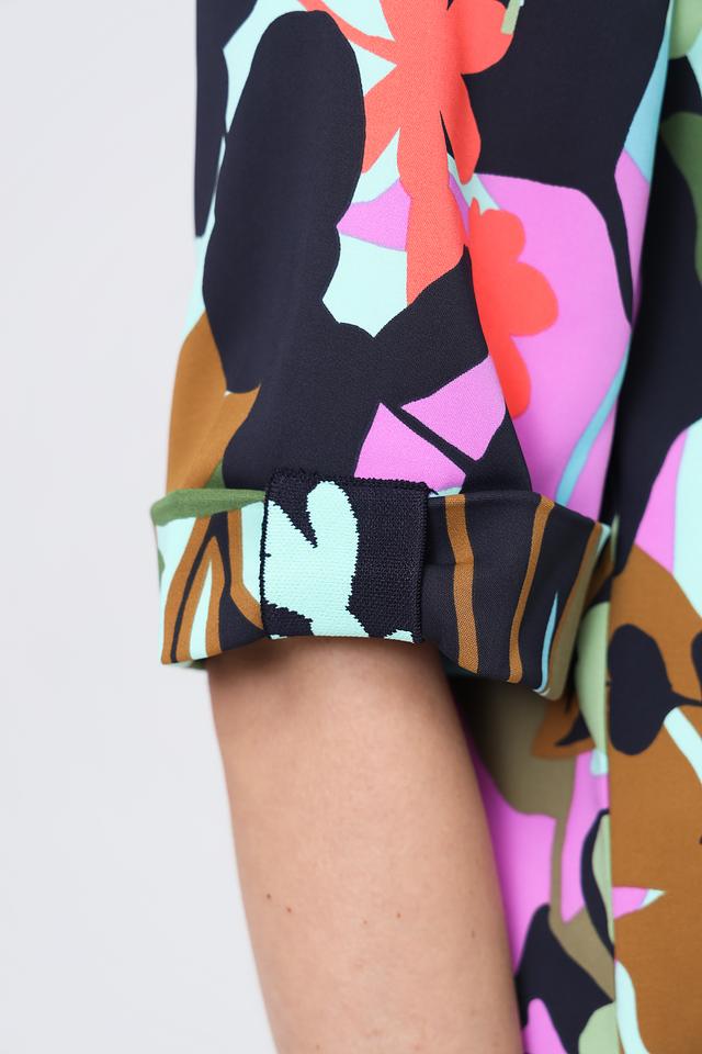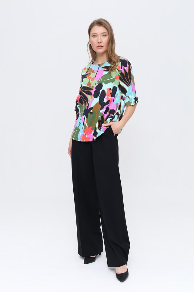 Блуза имеет свободный крой, короткие рукава и округлый вырез горловины с небольшой декоративной V-образной вставкой. Главная особенность этой модели – эффектный цветочный принт, выполненный в разнообразных оттенках: от нежно-розового и лайма до насыщенного коричневого и тёмно-зелёного.