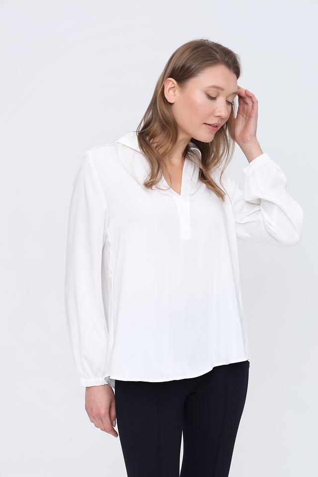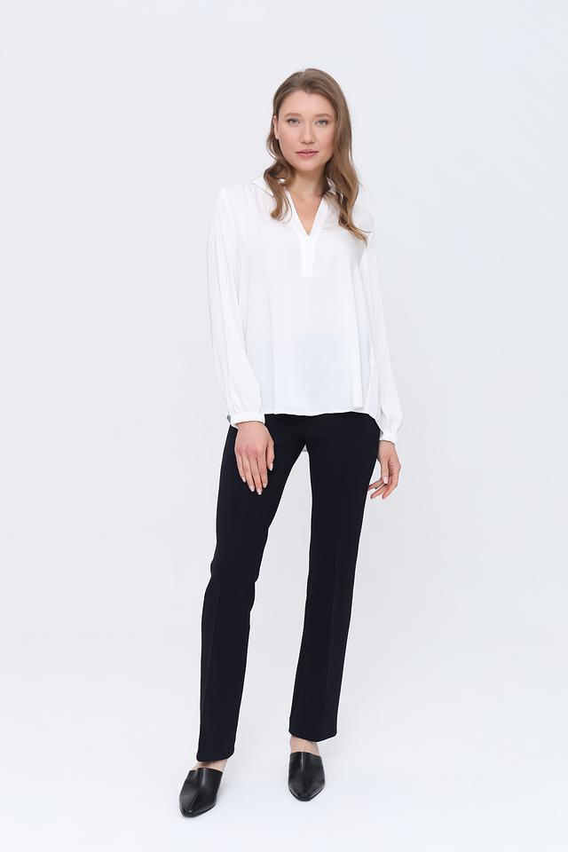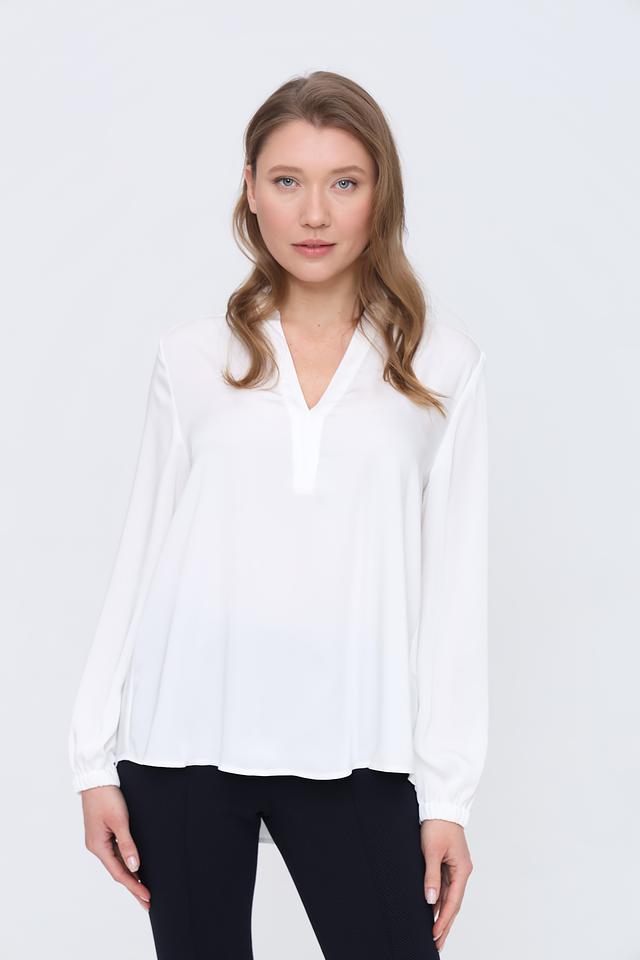 Модель имеет V-образный вырез, который визуально удлиняет шею и придает образу женственность. Длинные рукава с манжетами и небольшими складками добавляют изысканности. Свободный крой обеспечивает комфорт при носке и позволяет создать расслабленный, но стильный образ.