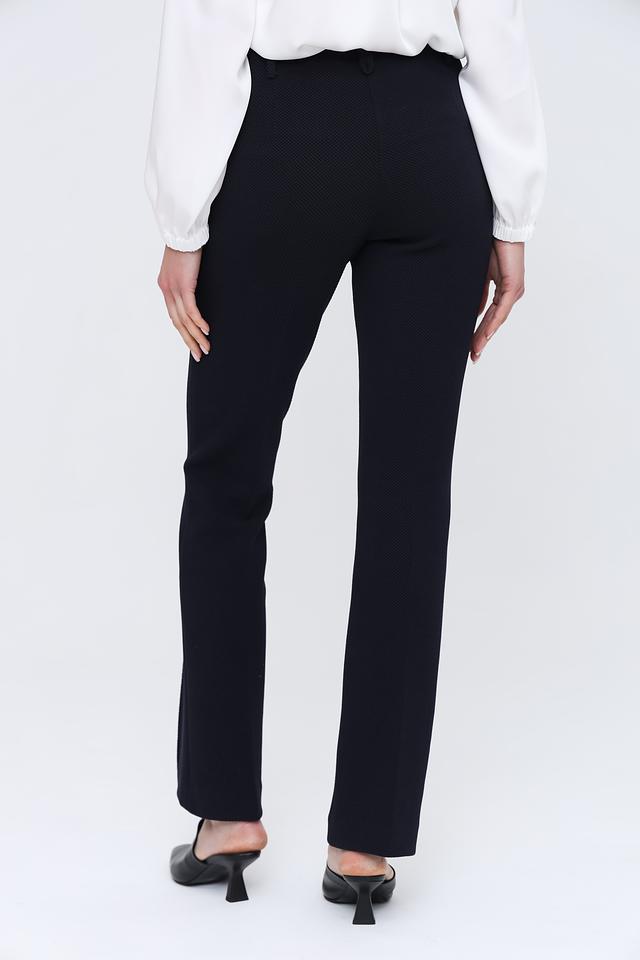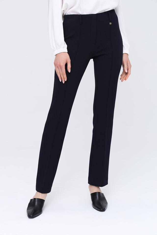 Брюки имеют прямой крой и стандартную посадку по фигуре. Ткань с текстурированным узором придает им особый шарм и изысканность. Застежка на пуговицу и молнию обеспечивает удобство и надежность.