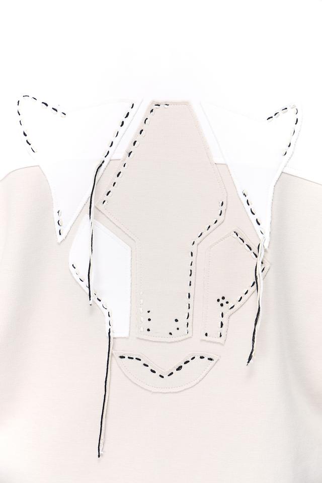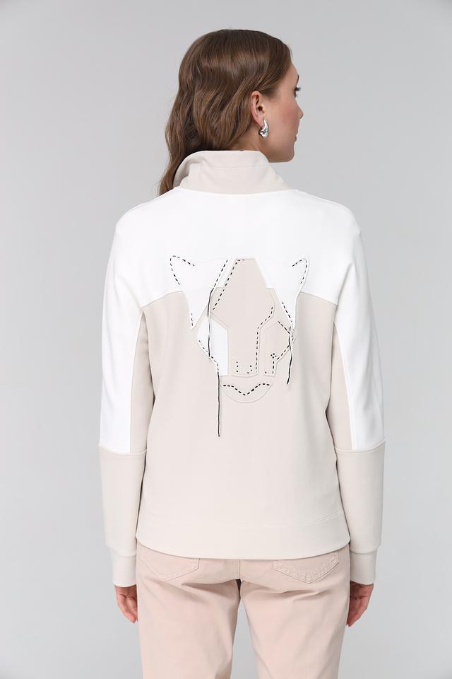 Жакет отличается контрастной отделкой черного цвета вдоль молнии и на рукавах, что придает ему современный и динамичный вид. На спине изделия выполнена декоративная вышивка, добавляющая оригинальности.
