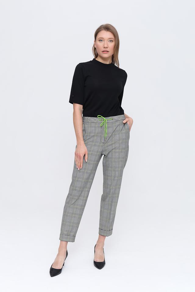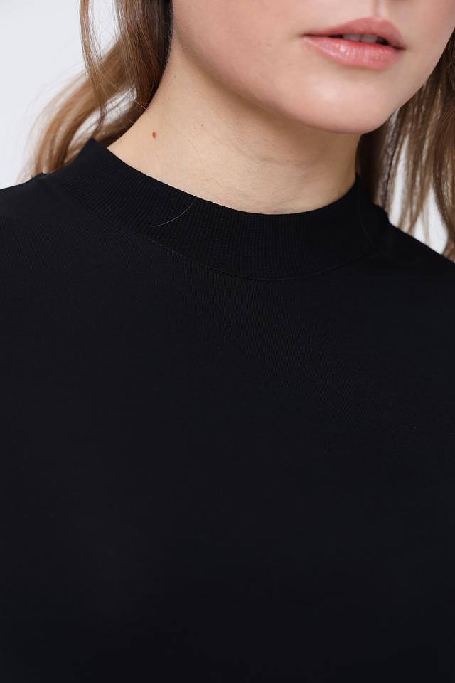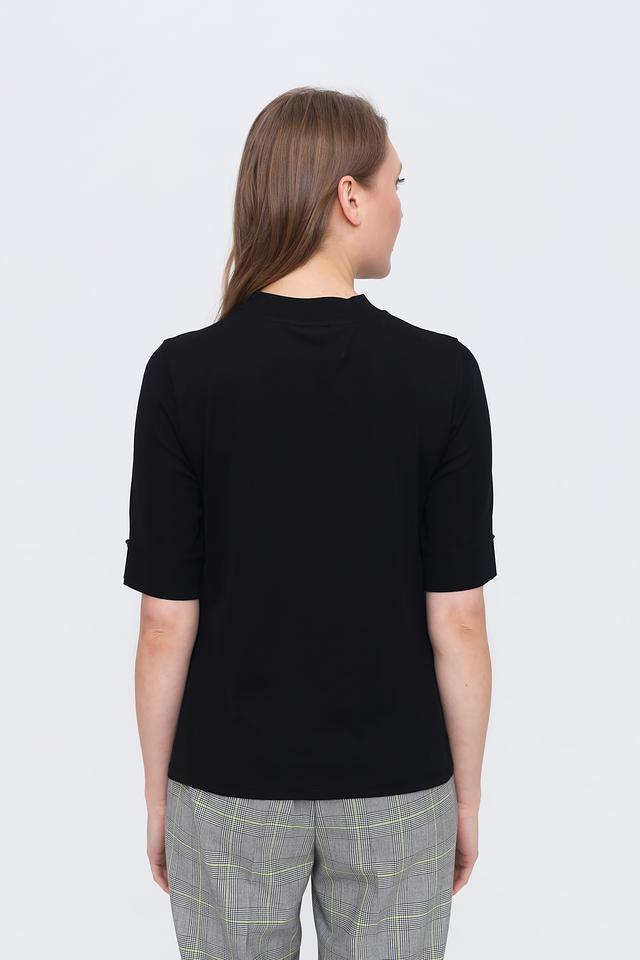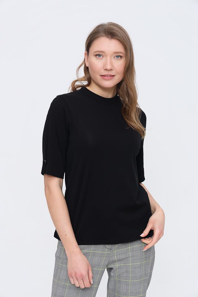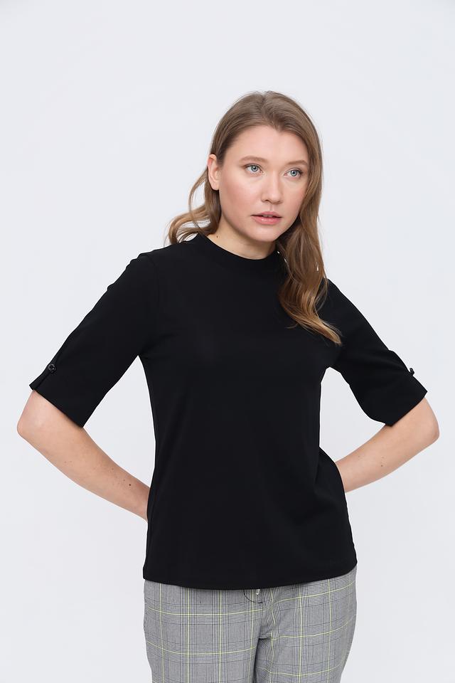 Футболка имеет классический крой и короткие рукава 3/4, которые придают ей особый шарм. Манжеты рукавов украшены декоративными элементами, добавляющими изысканности. Высокий круглый вырез горловины подчеркивает линию шеи и делает образ более женственным.