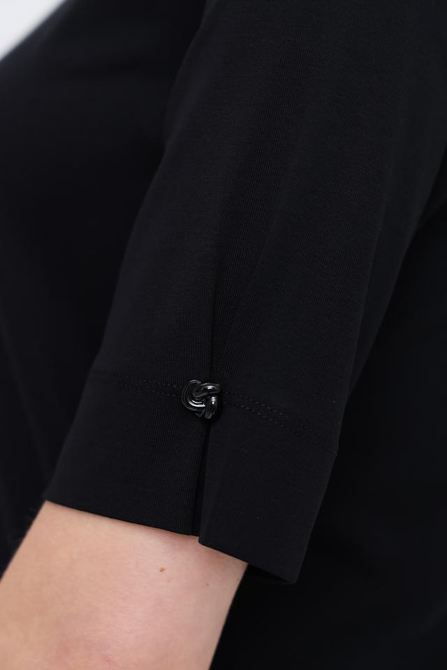 Чёрная футболка Marc Cain с рукавами 3/4 и декоративными элементами на манжетах. Изготовлена из мягкого хлопка с добавлением эластана для комфортной посадки и свободы движений. Стильный и лаконичный дизайн. Состав: хлопок 95%, эластан 5%