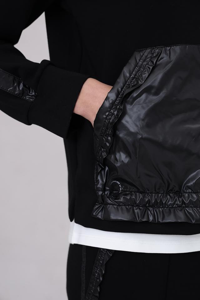 Жакет выполнен в классическом чёрном цвете, который легко сочетается с другими элементами одежды. Основная часть изделия выполнена из плотного трикотажа, обеспечивающего комфорт и свободу движений. Вставки из стеганой ткани придают жакету современный и динамичный вид.