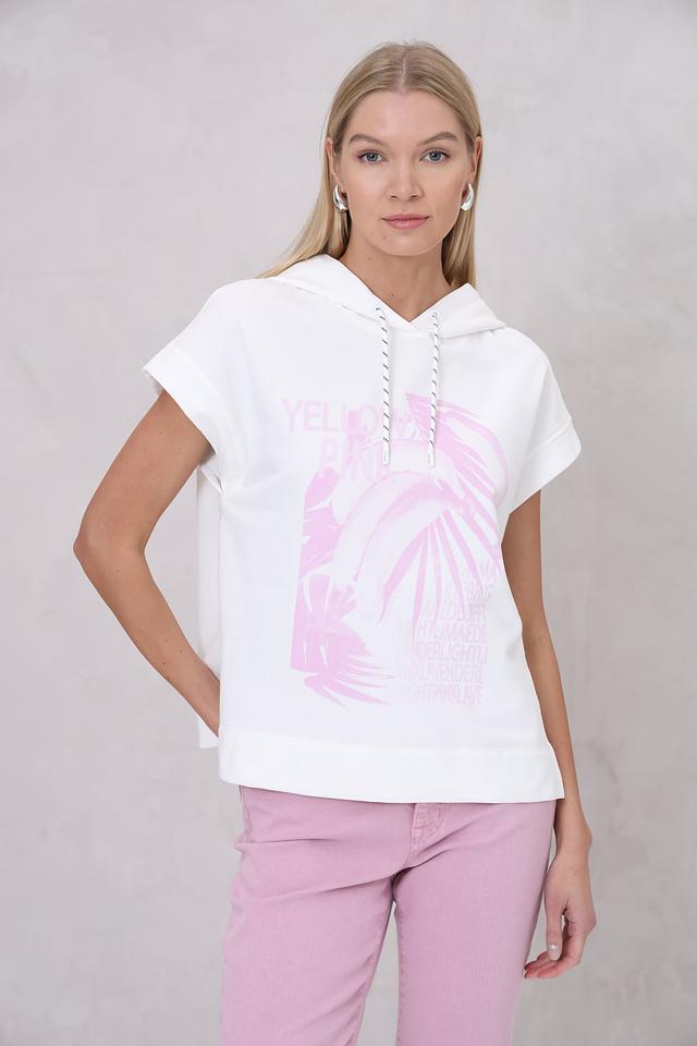 Белый пуловер от Marc Cain с короткими рукавами и принтом в виде пальмовых листьев. Модель с капюшоном и удобным кроем станет отличным дополнением к вашему образу. Состав: хлопок 80%, полиэстер 20%