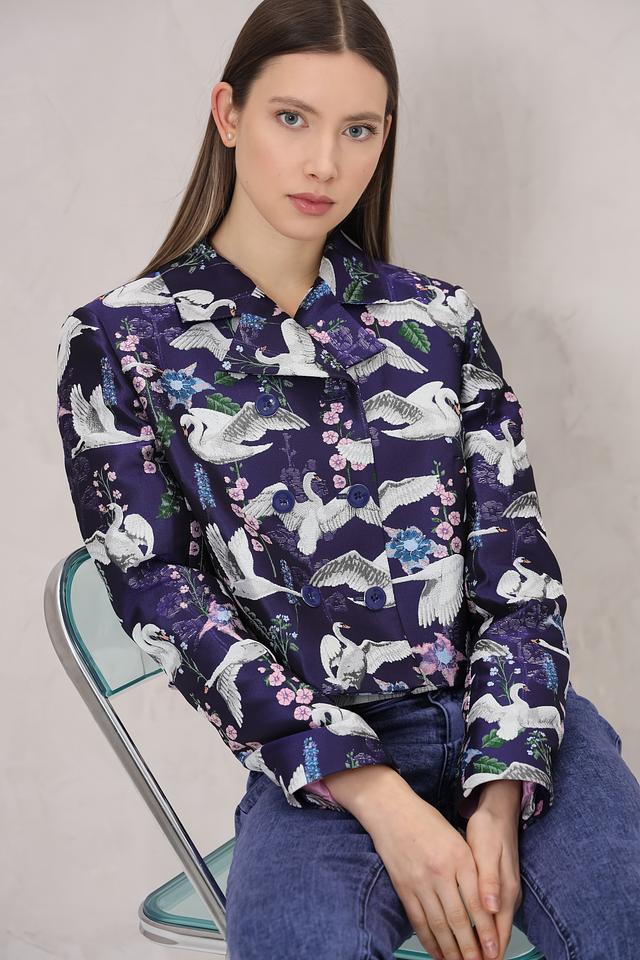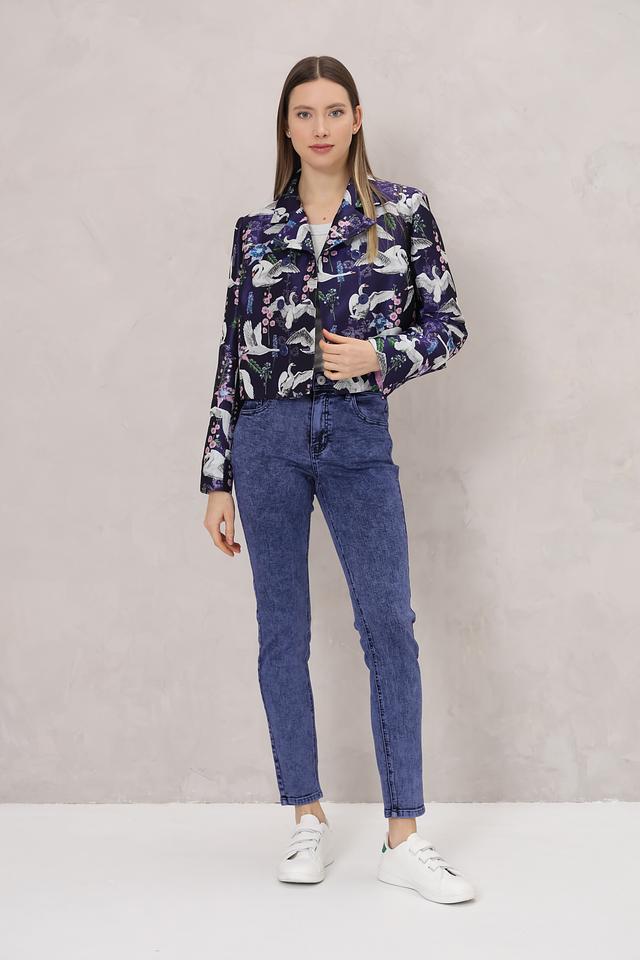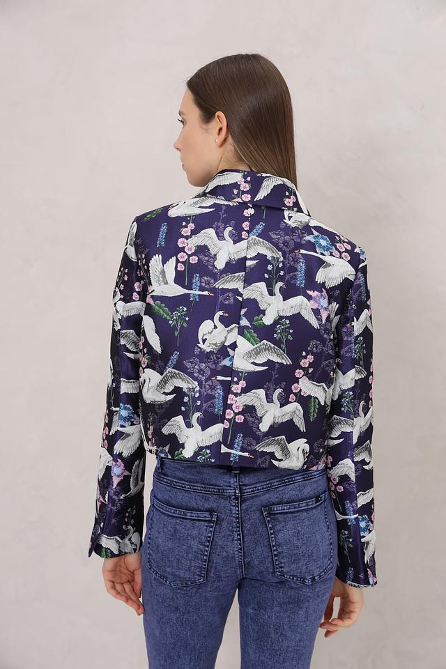 Жакет Marc Cain насыщенного синего цвета с оригинальным принтом в виде птиц станет ярким акцентом вашего образа. Модель выполнена из полиэстера с добавлением металлизированных волокон, что придает ей благородный блеск и износостойкость. Состав: полиэстер 96%, металлизир. волокно 4%