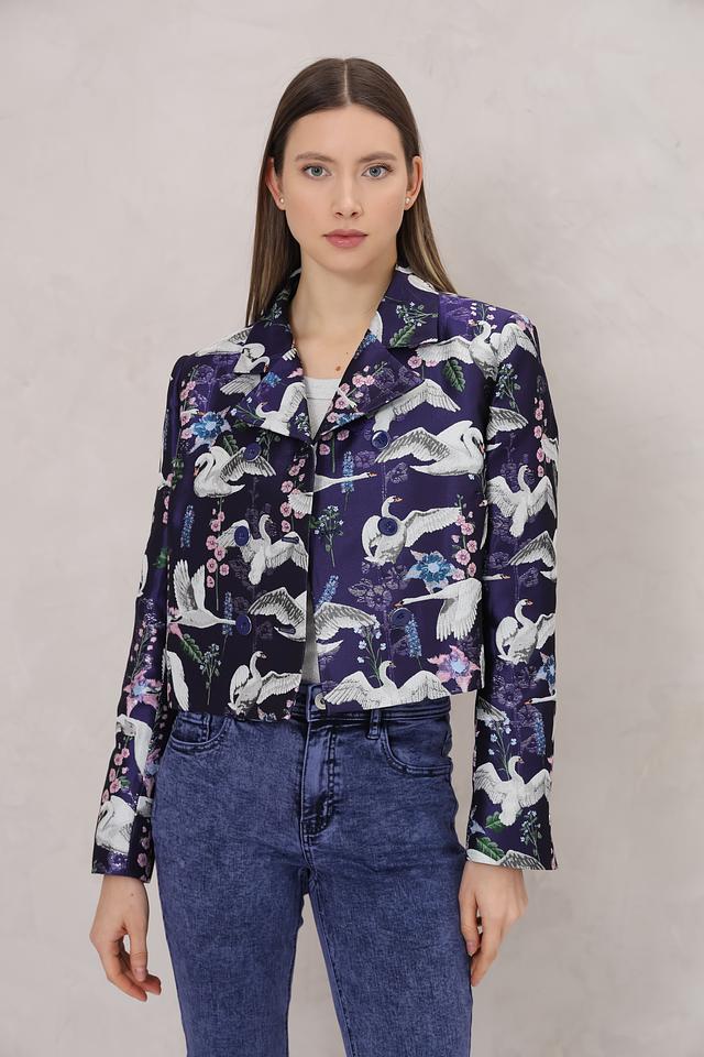Этот стильный жакет от Marc Cain станет прекрасным дополнением к вашему гардеробу. Жакет выполнен в насыщенном синем цвете и украшен эффектным принтом с изображением птиц и нежных цветов.
