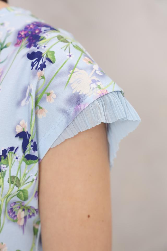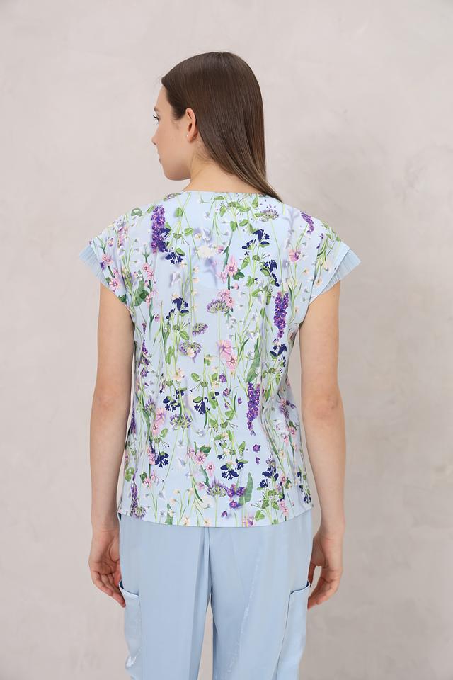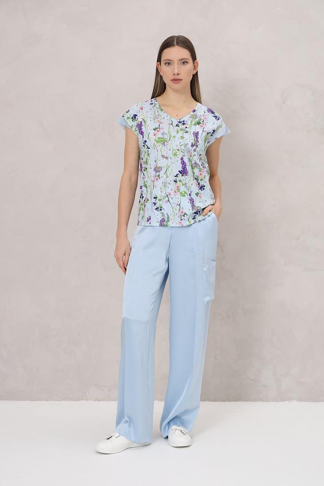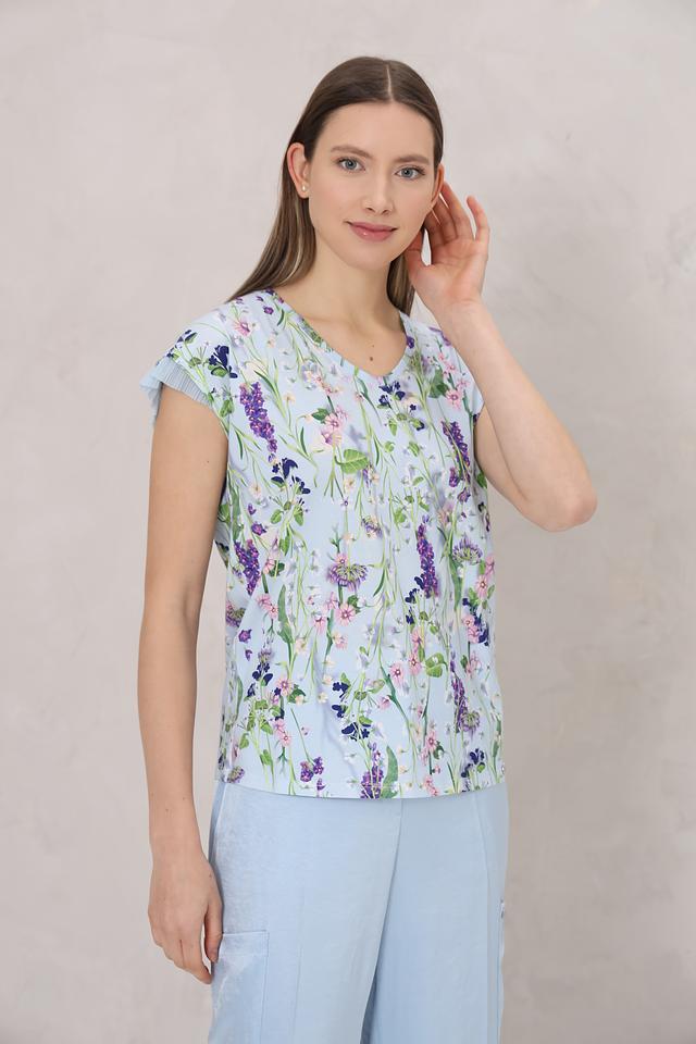 Лёгкая блуза Marc Cain светло-голубого цвета с нежным цветочным принтом станет прекрасным дополнением к вашему гардеробу. Изготовлена из хлопка с добавлением эластана для комфорта и свободы движений. Состав: хлопок 92%, эластан 8%