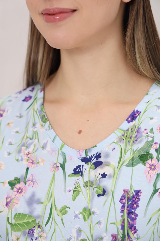 Блуза имеет V-образный вырез горловины и короткие рукава с небольшими воланами, что придаёт ей лёгкость и женственность. Принт расположен по всей поверхности изделия, создавая яркий и запоминающийся образ.