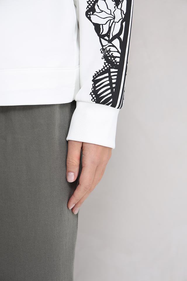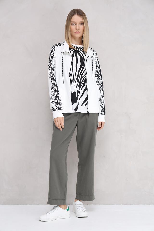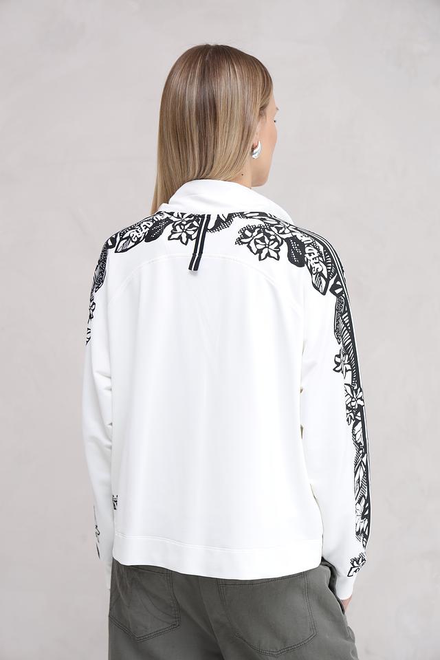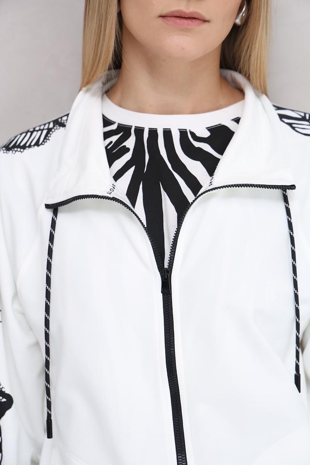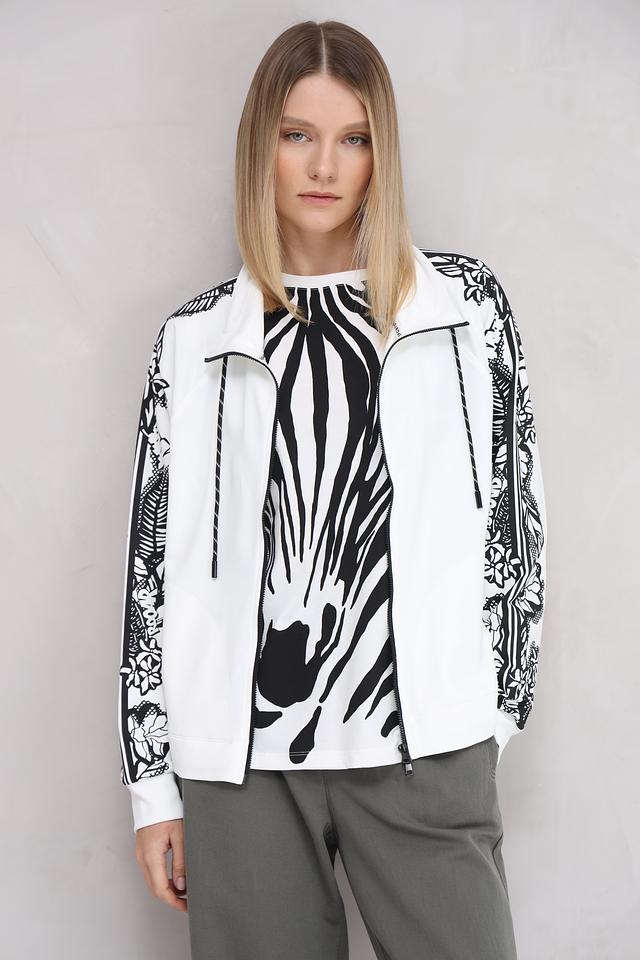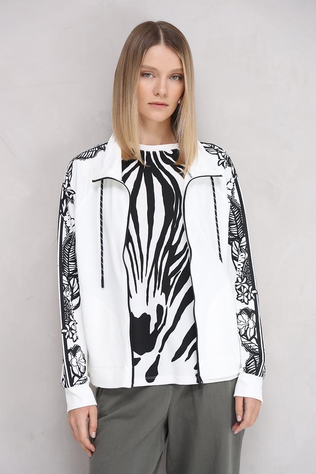 Белый кардиган Marc Cain с оригинальным принтом в виде зебры и цветочным узором на рукавах. Модель на молнии с капюшоном и шнурками для регулировки. Состав: полиамид 64%, хлопок 33%, эластан 3%