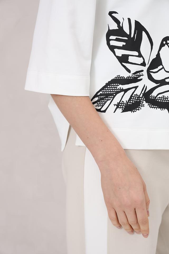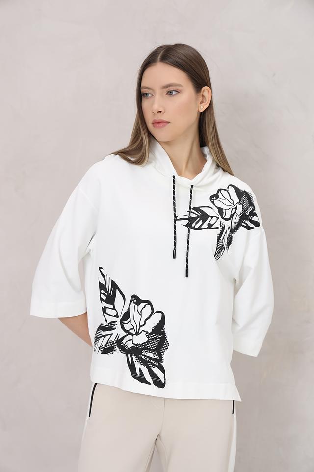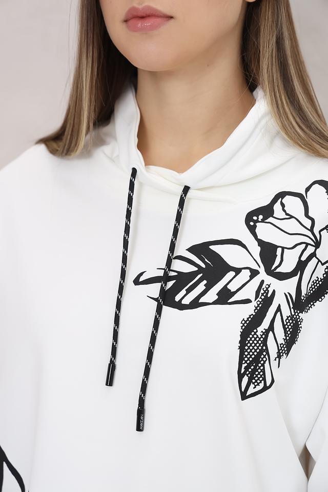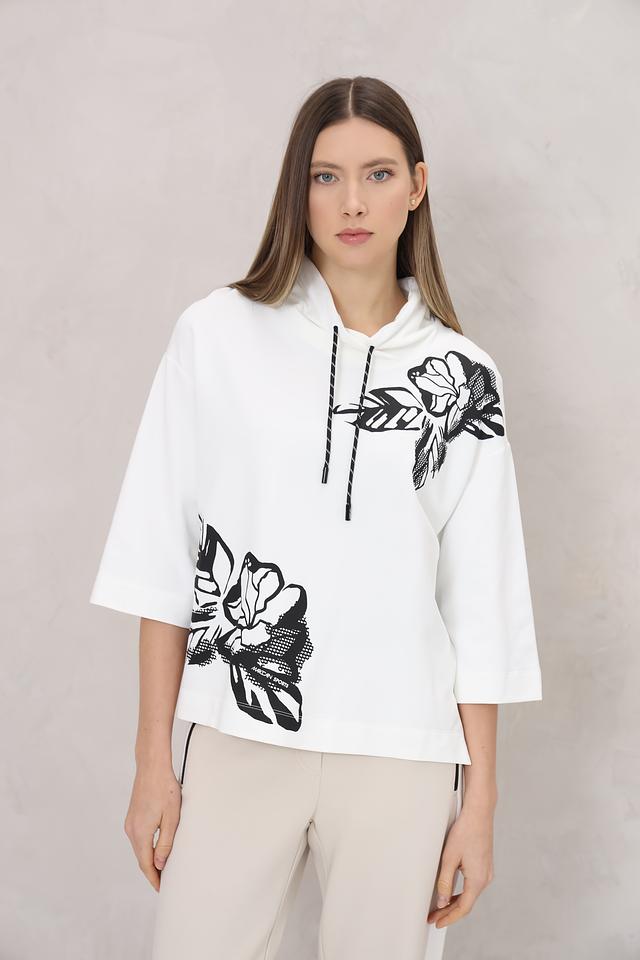 Белый пуловер Marc Cain с короткими рукавами и цветочным принтом. Модель с капюшоном и шнурками, выполненная из мягкого трикотажа, станет стильным дополнением к вашему гардеробу. Состав: полиамид 64%, хлопок 33%, эластан 3%