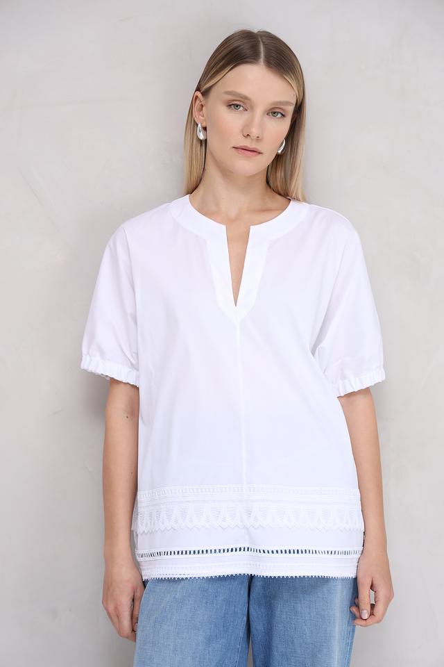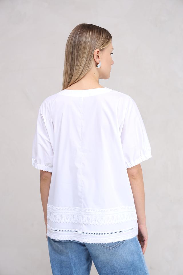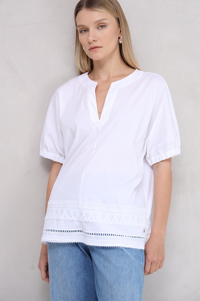 Белая блуза Marc Cain из хлопка с изящным кружевным декором. Модель имеет свободный крой, короткие рукава с оборками и V-образный вырез горловины, что придает ей лёгкость и женственность. Состав: хлопок 75%, полиамид 20%, эластан 5%