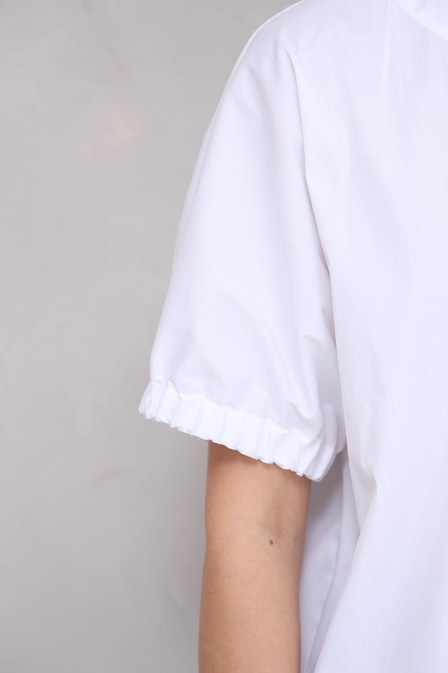 Модель отличается свободным кроем, который обеспечивает свободу движений и не сковывает. Короткие рукава с аккуратными оборками придают блузе романтичный вид. V-образный вырез горловины деликатно подчеркивает зону декольте.
