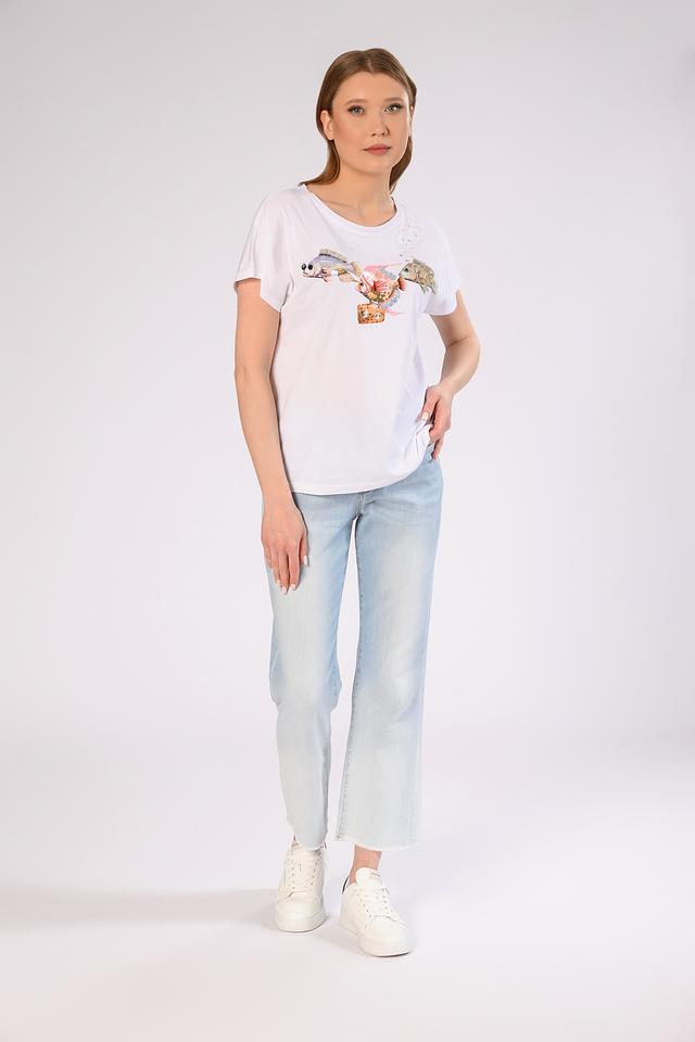 Джинсы имеют классический прямой крой с небольшим заужением к низу и слегка укороченную длину, что придает им современный вид. Эффект потертости добавляет образу непринужденности и индивидуальности.