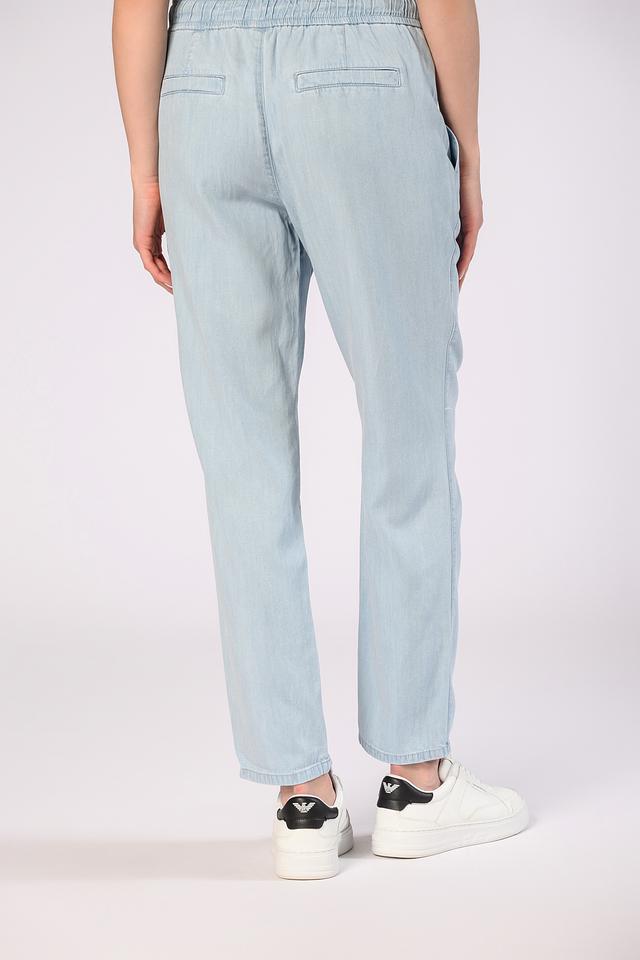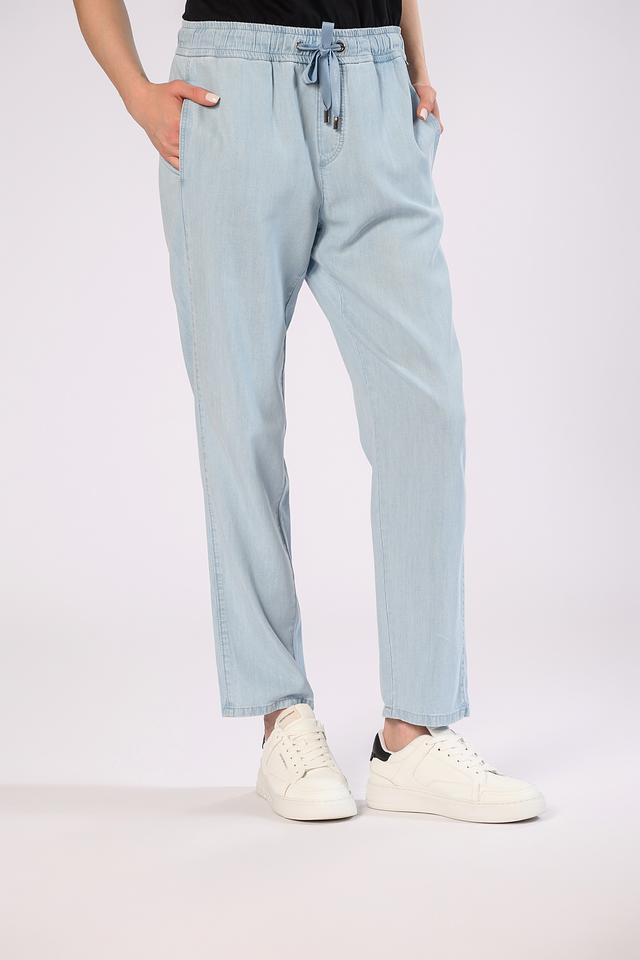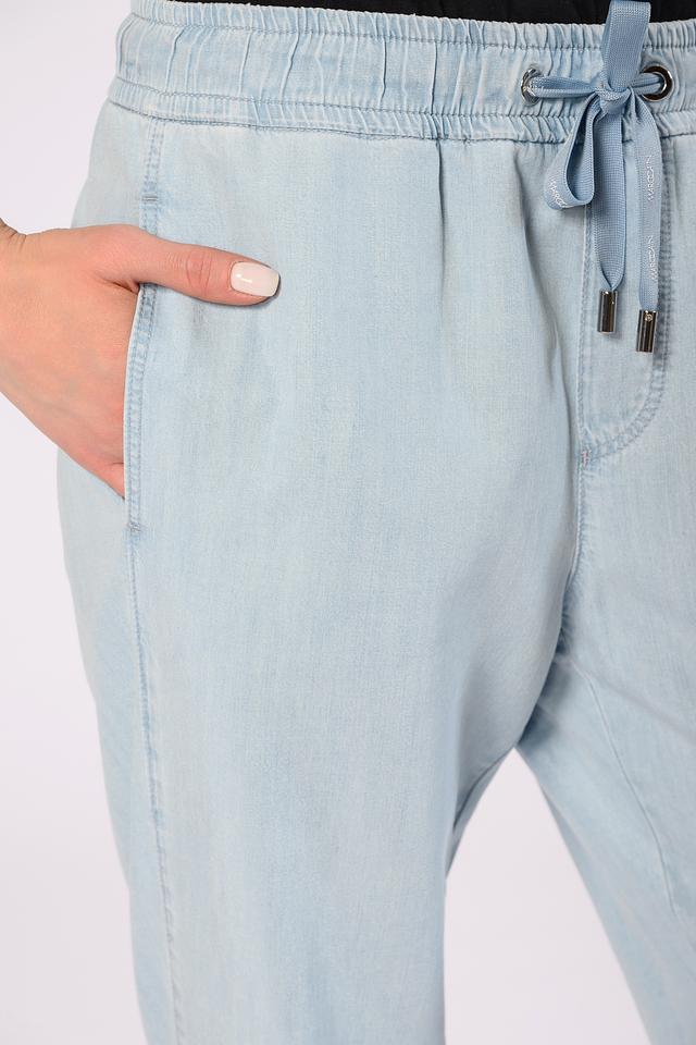 Брюки имеют прямой крой и эластичный пояс с кулиской, благодаря чему идеально садятся по фигуре и не сковывают движений. Светло-голубой цвет делает их универсальными и легко сочетаемыми с различными элементами одежды.