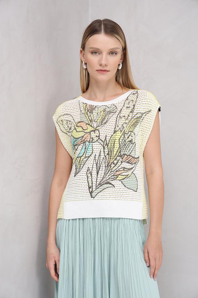 Этот элегантный топ от Marc Cain станет прекрасным дополнением к вашему образу. Выполнен в белом цвете и украшен оригинальным цветочным принтом, выполненным в нежных пастельных тонах.