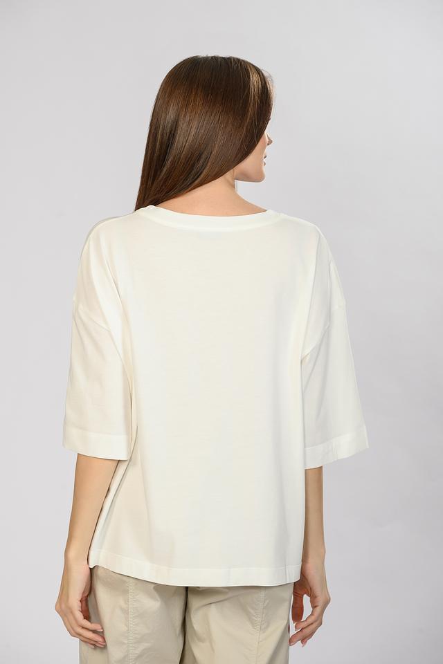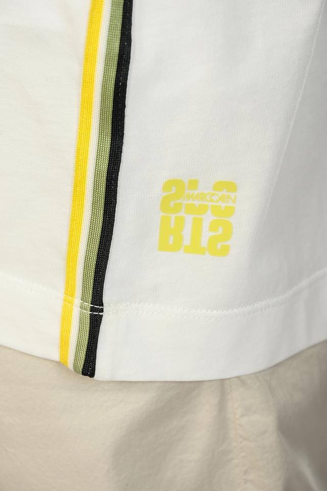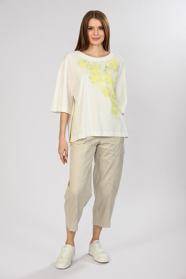 Белая футболка Marc Cain с ярким принтом в виде листьев лаймового цвета. Модель свободного кроя с рукавами 3/4 и декоративной полосой на боку, выполнена из 100% хлопка. Состав: хлопок 100%