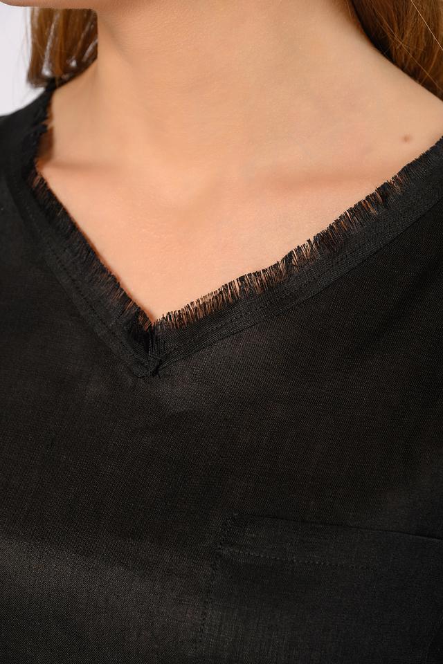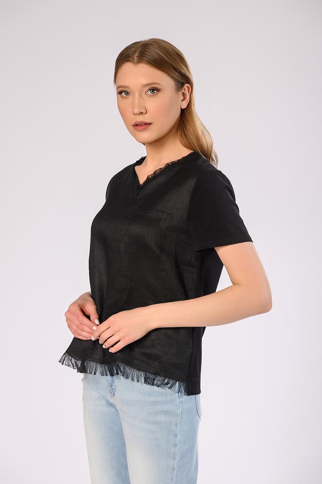 Блуза имеет прямой крой и короткие рукава, что обеспечивает комфорт в носке. V-образный вырез горловины добавляет образу женственности. Особый акцент сделан на декоративной обработке краев бахромой, которая придает блузе оригинальность и лёгкую небрежность.